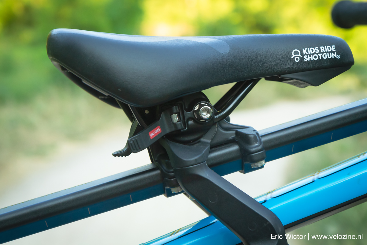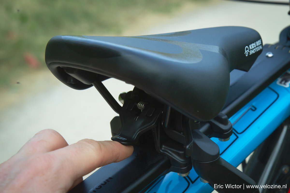 Het Kids Ride Shotgun-zitje is natuurlijk in alle opzichte een veel betere variant op bovengenoemd idee. Deze is bedoeld voor offroad gebruik en is daarom met name lichter en steviger. Maar ook véél ergonomischer, zowel voor de rijder, de kleine co-piloot, als de persoon die het geheel monteert. De bevestiging van het zitje zelf is er trouwens in twee varianten: één zitje dat ‘simpel’ zijdelings op de bovenbuis klemt (Shotgun 2.0) en de door ons geteste Pro versie. Deze laatste zit op een stang die om de zadelpen en een speciale spacer onder de stuurpen klemt (en dus niet je frame). Voeg hieraan een ministuurtje toe (want je eigen stuur zit voor een meerijdend kind echt véél te laag) dat ook nog eens in hoek en sweep instelbaar is.