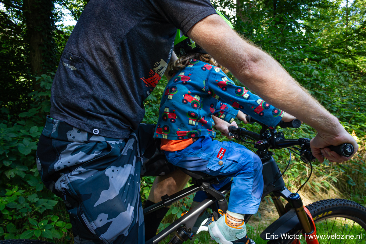 15 kilo halverwege je bovenbuis zit natuurlijk en beetje in de weg als je zelf trapt. Je zal onherroepelijk met je knieën wat meer dan normaal naar buiten moeten rijden. Erg is het geenszins, maar besef tegelijkertijd dat er niet heel veel optimalisatie mogelijk is: je kind moet goed zitten en de rest is ondergeschikt. Ga je echt offroad rijden, koop voor jezelf ook setje vlakke pedalen en passende schoenen. Flats zijn in deze omstandigheden fijner voor je knieën. Bijkomend voordeel: bij een potentiële val met kind op je bovenbuis wil je zo snel mogelijk je voet(en) aan de grond.