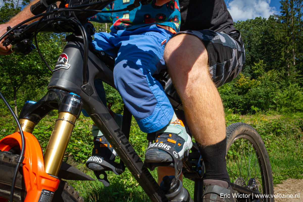 “Je zal onherroepelijk met je knieën wat meer dan normaal naar buiten moeten rijden. Erg is het geenszins, maar besef tegelijkertijd dat er niet heel veel optimalisatie mogelijk is: je kind moet goed zitten en de rest is ondergeschikt. Ga je echt offroad rijden, koop voor jezelf ook setje vlakke pedalen en passende schoenen.”