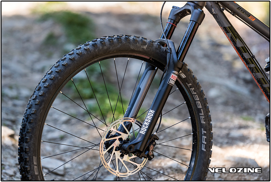 In mijn geval is dat terrein de Alpen, waar ik graag lastige paadjes opzoek. En dus monteer ik in de Kona Honzo ST een set stevige wielen op basis van NoTubes Flow EX-velgen. Daaromheen een set 2.35 inch Fat Alberts van Schwalbe. Aan de voorkant hang ik niet een vork met de aanbevolen 120 mm veerweg, maar pak ik een RockShox Pike met twee centimeter méér. Beter mee verlegen dan om verlegen, zeg ik altijd maar. De remmerij komt bij Sram vandaan in de vorm van een set potente Guide-remmen, met twee paar zuigers in de remklauw en aan de voorkant een extra grote, 200 mm remschijf. Ook hier geldt weer: beter te veel dan te weinig! Icing-on-the-cake is een Fox Transfer dropper-post, in de bergen een wat mij betreft onmisbare accessoire!