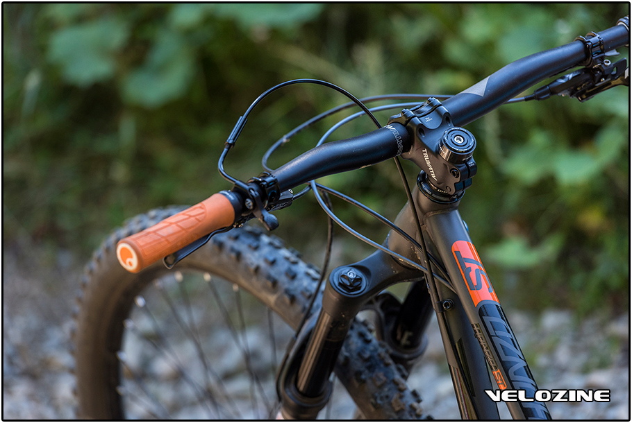 Dankzij de korte achtertrein til je bovendien bij geulen of kleine drops makkelijk het voorwiel even op. Daarbij fungeren de benen vervolgens als schokdemper. Natuurlijk, je moet alerter zijn dan op een fully, want het is en blijft een hardtail en het achterwiel heeft bij grote keien zo nu en dan de neiging als een boemerang terug te slaan. Maar dat is natuurlijk relatief. Want bij kleine wielen is dat effect veel sterker en hinderlijker dan bij de grote hoepels van de Honzo.