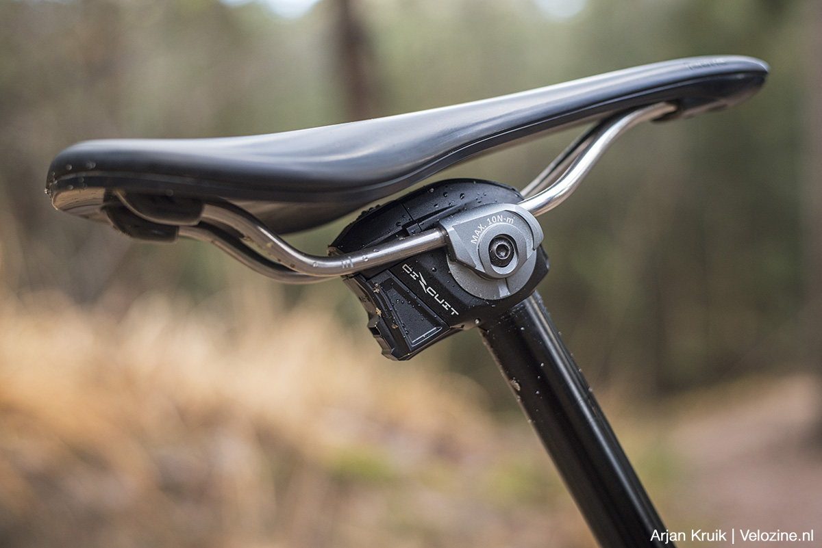 De zadelpenkop is goed doordacht. Het instellen van de zadelhoek doe je eenvoudig met een inbus aan de voorzijde van de kop. En na het vasttrekken van de zadelrails zit alles goed vast. Geen gekraak, geen speling en géén verloop.