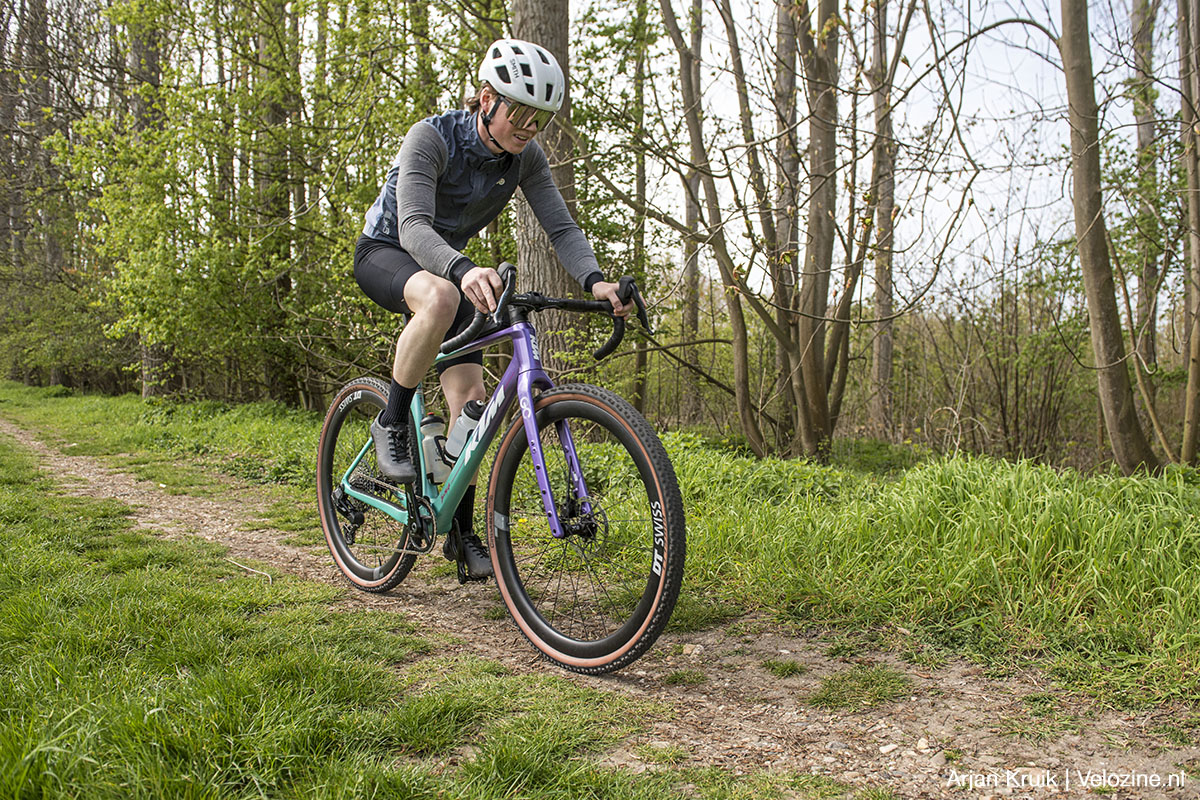 Op smalle, onverharde slingerpaadjes daarentegen zijn de Pirelli’s in hun element. En de rest van de fiets ook trouwens. In snelle bochten is het gewicht mooi over beide wielen verdeeld en in lastige afdalingen biedt de Gravelator veel vertrouwen. De korte stuurpen, het korte en ondiepe stuur en niet te vergeten de relatief lange reach van het frame dragen daar ongetwijfeld aan bij.