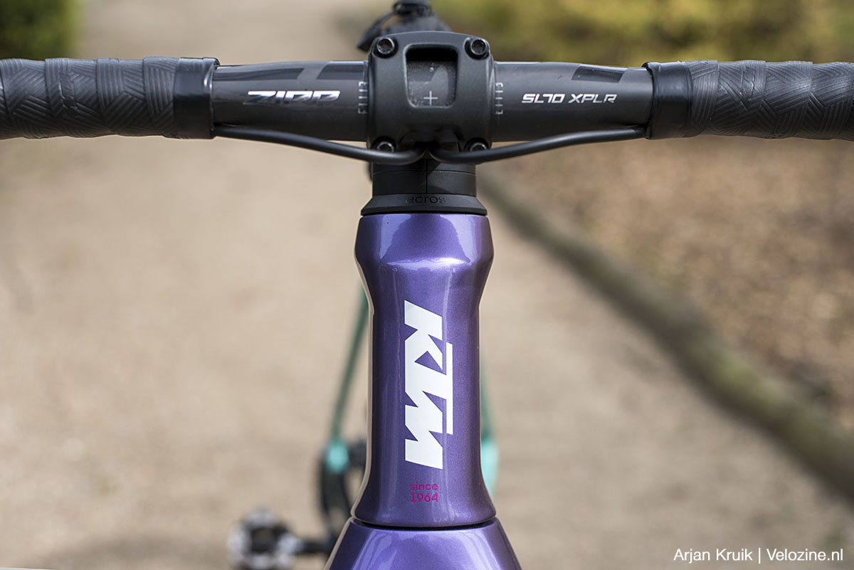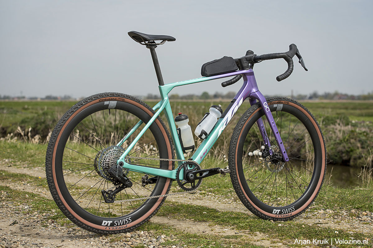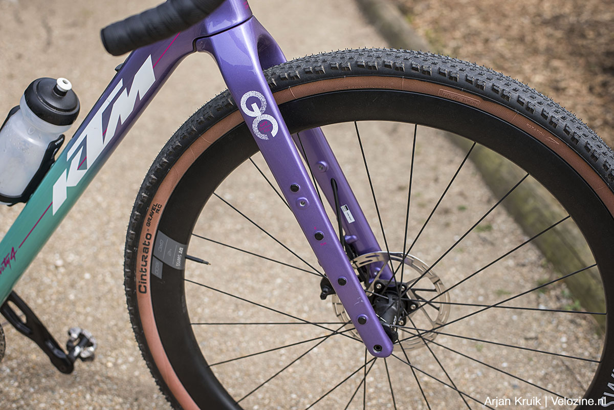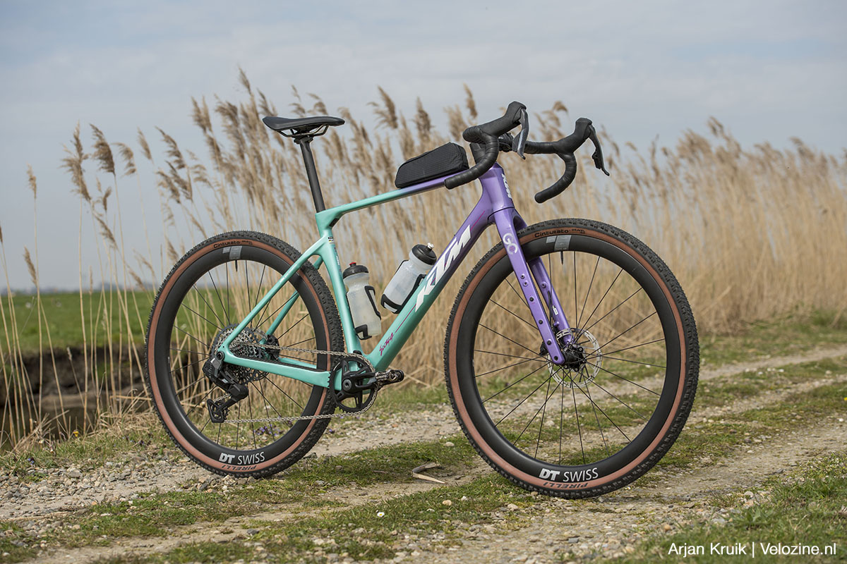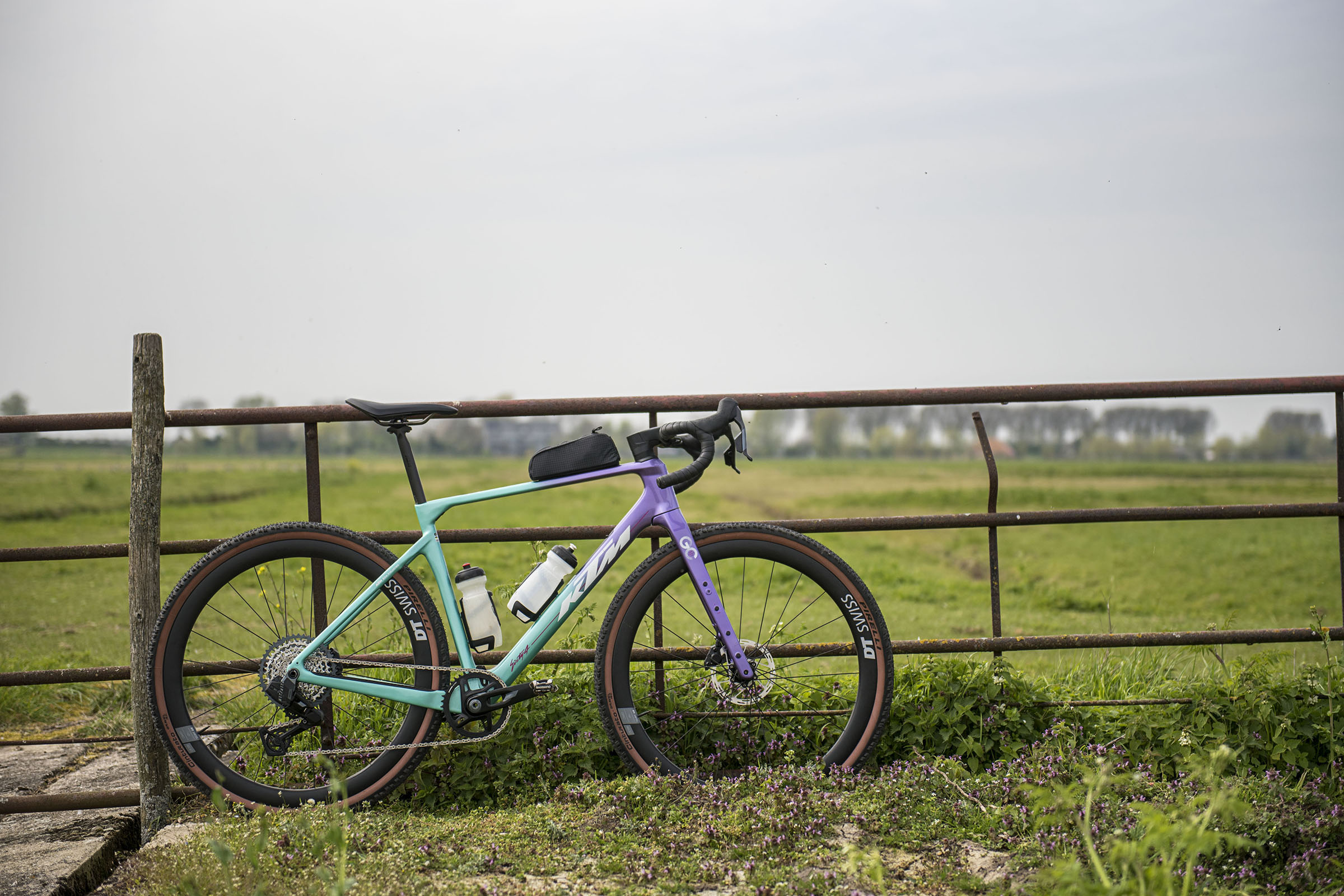 Opvallend: de groen paarse KTM ontziet je zitvlak. Ik ben me ervan bewust dat de 45 millimeter brede banden het leeuwendeel van de demping op zich nemen, maar de fiets zelf draagt toch ook het nodige bij. De carbon zadelpen geeft dankzij z’n speciale constructie voelbaar mee als het achterwiel een obstakel raakt. Niet dat de oneffenheden worden weggenomen, maar de scherpe randjes verdwijnen wel. En aan het eind van een lange dag fietsen zijn m’n zitvlak en rug daar blij mee.