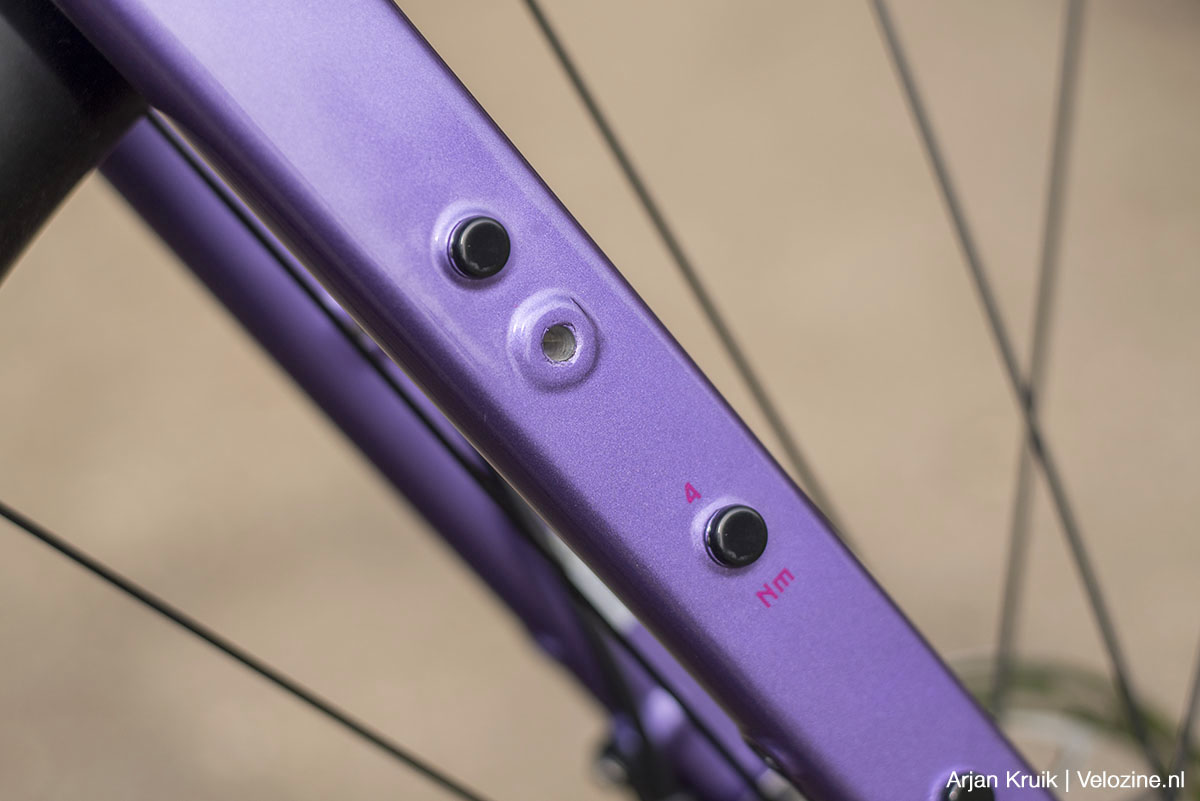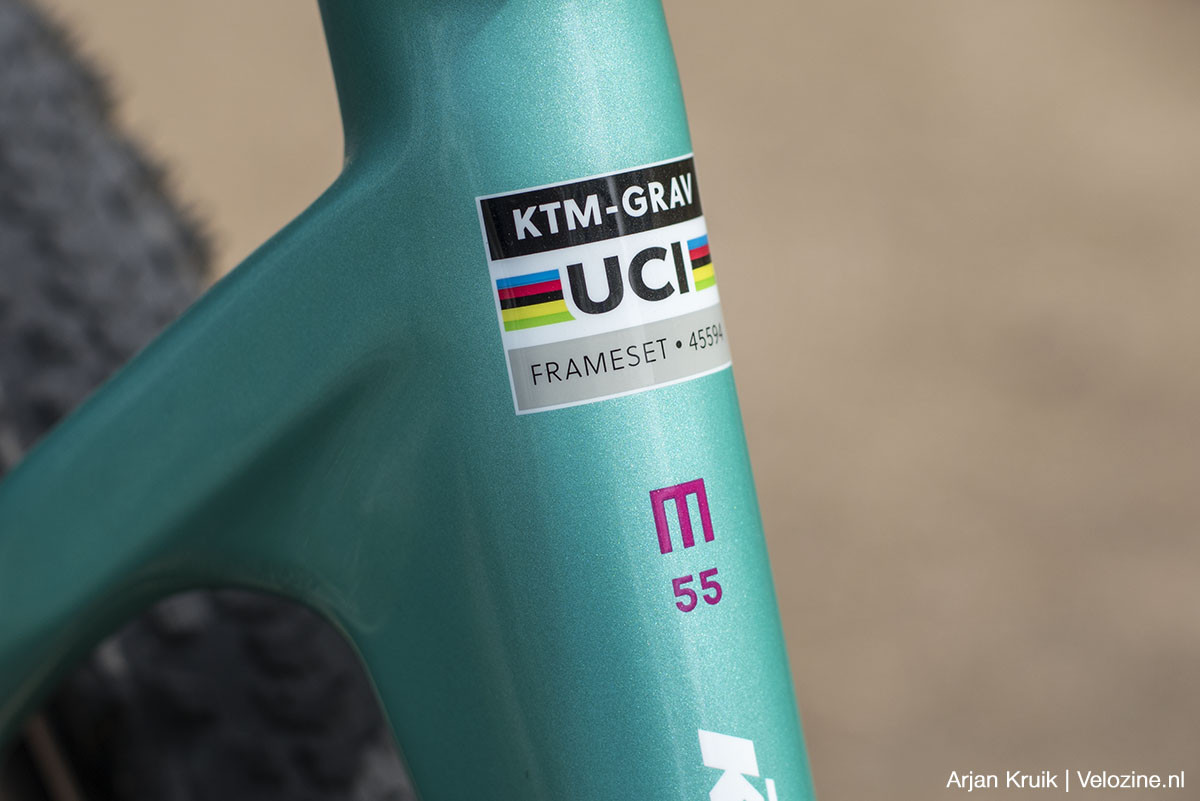 Als het gaat om nokjes om van alles op en aan te schroeven is de KTM Gravelator sowieso niet bepaald exhibitionistisch. Maar als je goed kijkt zitten alle noodzakelijke montagepunten zitten er wel op. Frame en voorvork bieden de mogelijkheid dragers en spatborden te monteren. Mocht je dat laatste willen: in dat geval passen er 40 millimeter banden in het frame.