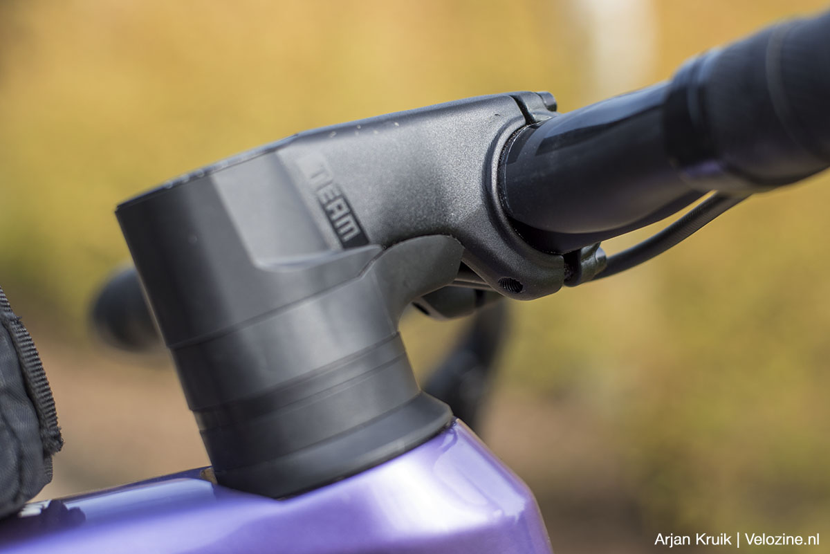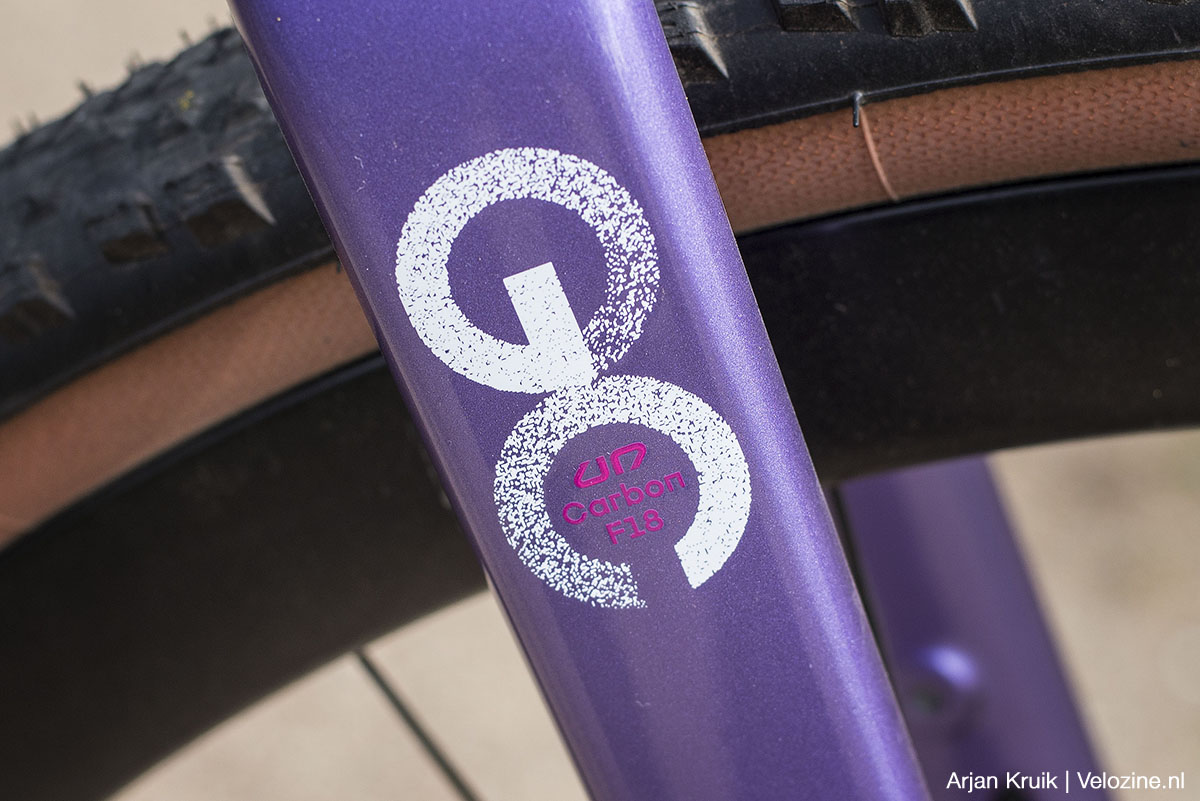 De Gravelator is in de Prime-uitvoering uitgedost in smaragdgroen en paars. Die kleuren zijn geïnspireerd op een oude KTM-racefiets uit het begin van de nineties. Alhoewel niet iedereen op de redactie het met me eens is, vind ik het vette kleuren. Ook opvallend, maar dan op een andere manier, is de aerodynamisch geoptimaliseerde vormgeving van de balhoofdbuis en de daarin geïntegreerde voorvork. Met een velghoogte van 42 millimeter versterken de carbon wielen de aero-look van de Gravelator.