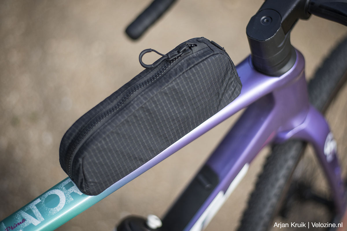 Nieuw is een klepje dat toegang geeft tot de binnenkant van de bovenbuis. Omdat het de fietsindustrie is noemt KTM dat gat in de bovenbuis niet gewoon gat in de bovenbuis, maar FIS, van full integrated storage. En dat klepje heet geen klepje, maar HUT, van helpful universal tool. Het klepje dubbelt namelijk als houder van een minitool, een kettingpons, een bandenlichter en een CO2-patroon. En daarnaast tref je in die onderbuis een praktische buidel aan. Heel ruim is het allemaal niet, maar een binnenbandje of een compact regenjasje krijg je er wel in.