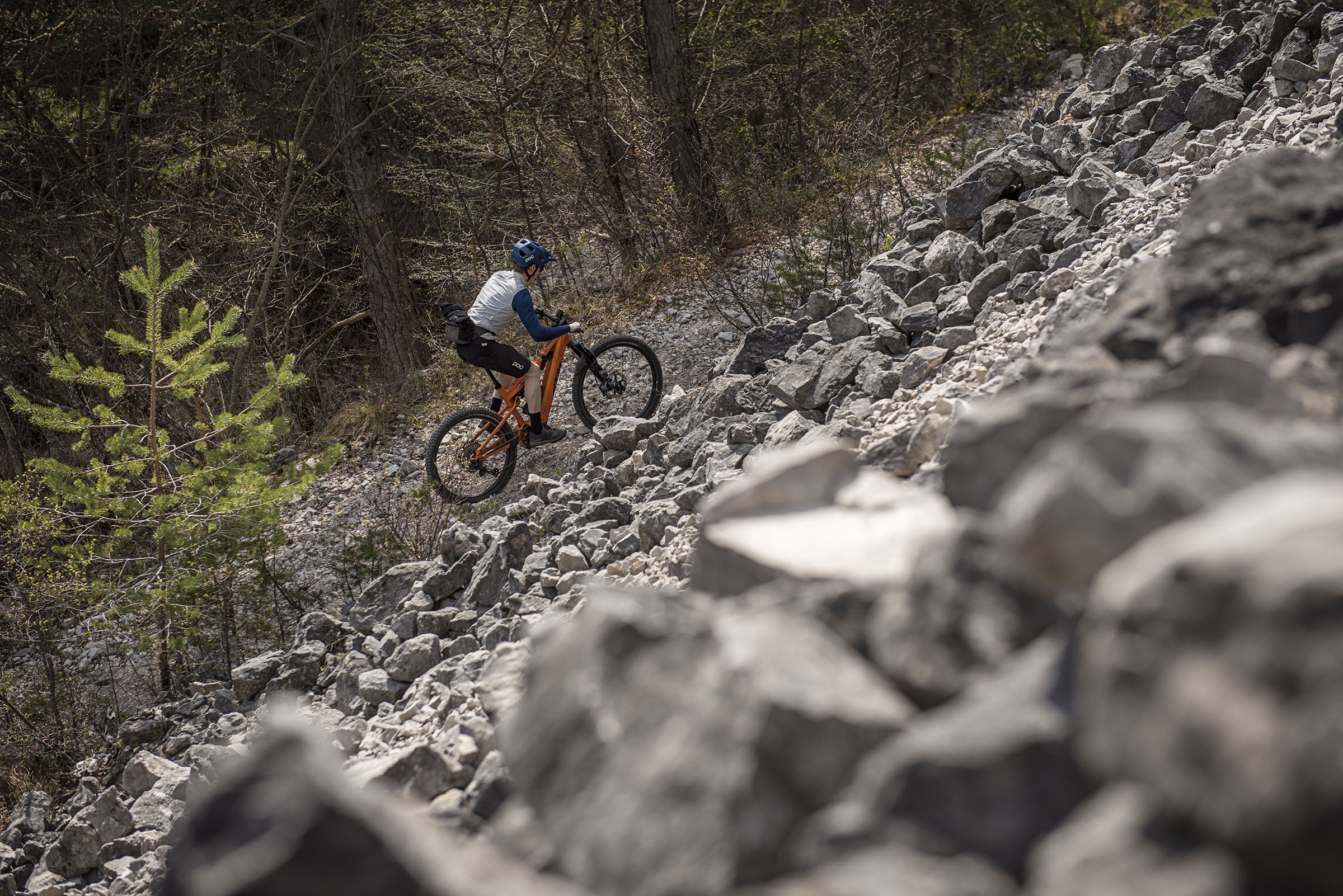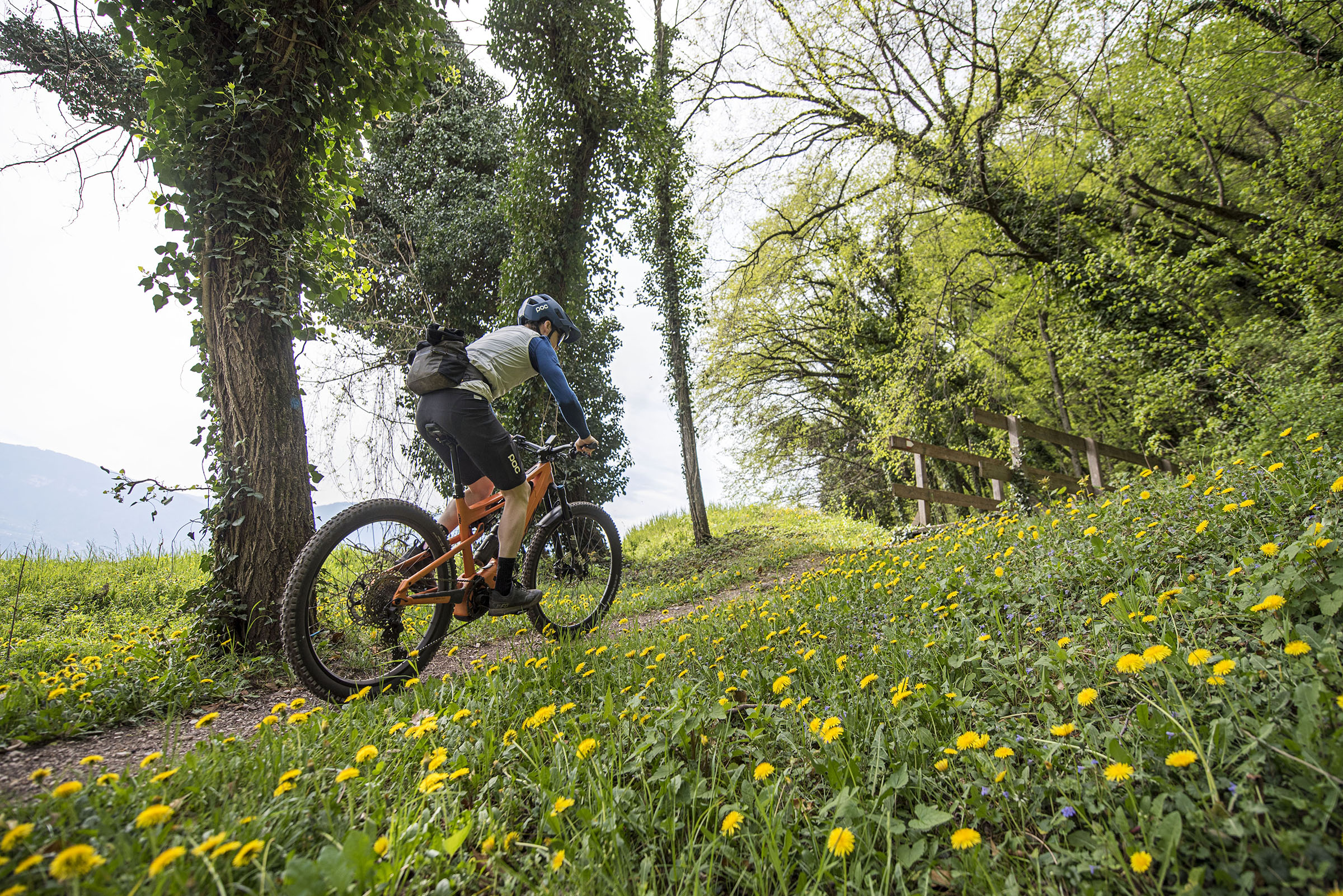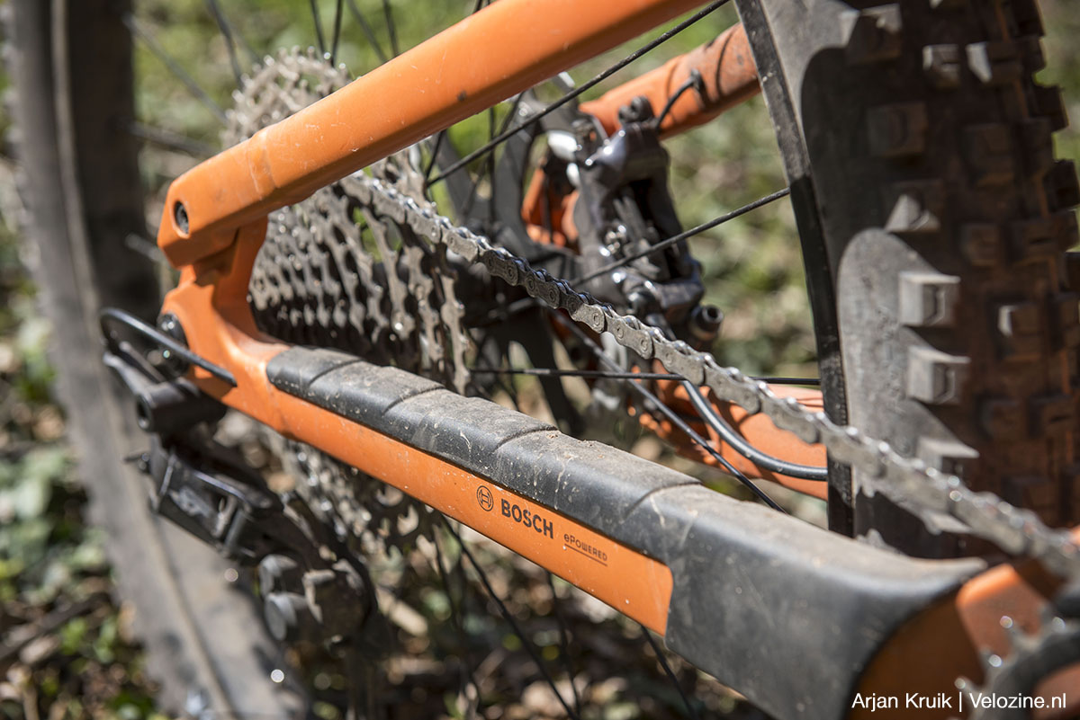 Alhoewel de steile zitbuishoek in de aanloop naar de beklimming om gewenning vraagt, blijkt de effectiviteit van dit geometriekenmerk zodra het pad begint te stijgen. Ontspannen kan ik de hoogtemeters onder me wegtrappen. Het nut van de rechte zitzuil wordt nog duidelijker als we het pad verlaten en een singletrack induiken. Omhoog, welteverstaan. Het klimmen over de smalle, met wortels en stenen bezaaide trail gaat met een verrassend gemak. Ja logisch, denk je nu, met een dikke motor in het vooronder. Maar dat is maar een deel van het verhaal.