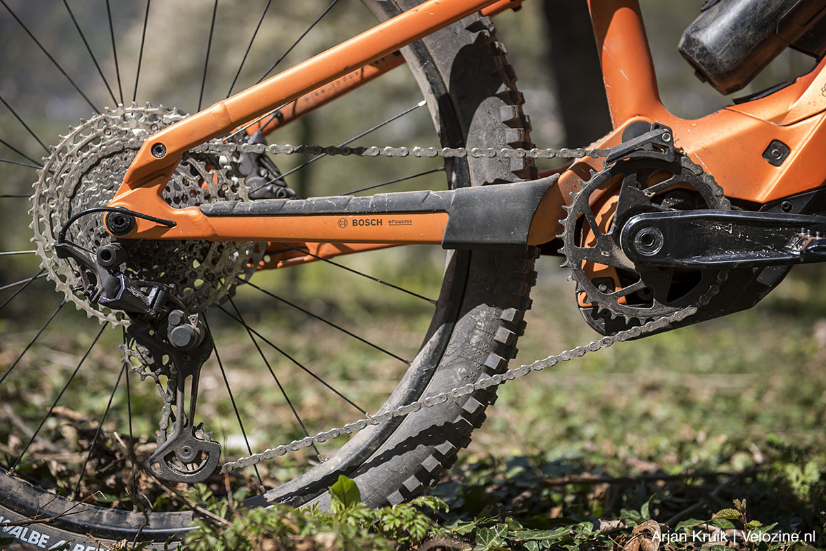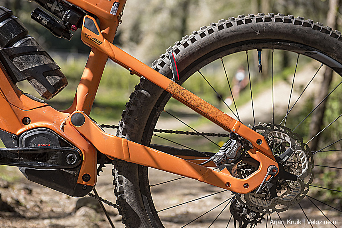 De Fox 36 Performance aan de voorkant is een beetje een verrassende keuze. Immers: veel fabrikanten monteren bij een e-mountainbike van dit kaliber over het algemeen een stijvere Fox 38 of dito Rockshox Zeb. Maar eerlijk gezegd heb ik de Fox 36 niet kunnen betrappen op een slap karakter: voor mijn gewicht van rond de 75 kilo is de 36 stijf genoeg. Wel zakt de vork in steile, technische secties naar mijn smaak iets te ver in; voor wat meer tegendruk heb ik daarom de compressieknop wat dichter gedraaid.