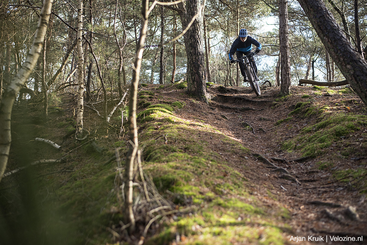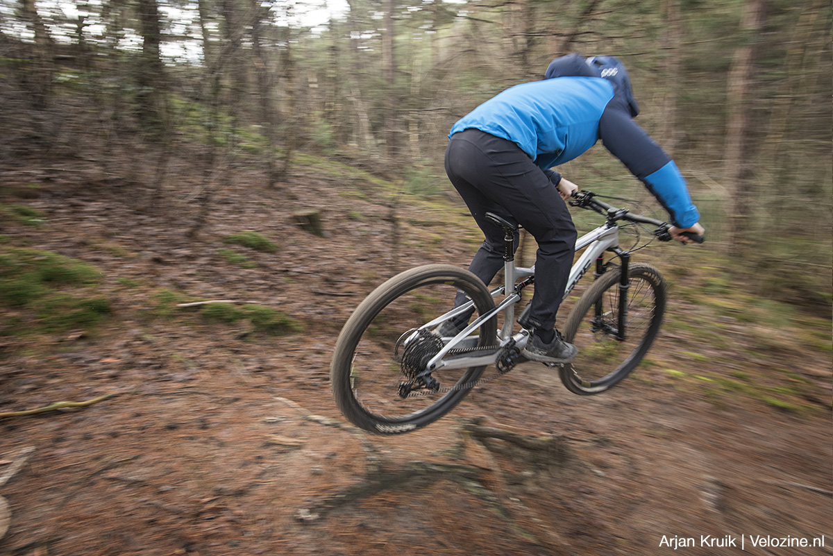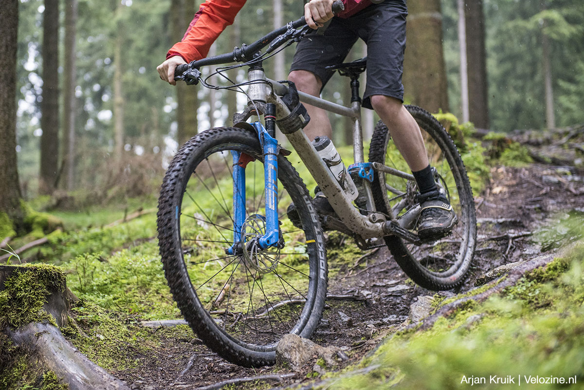 Ik mopperde hierboven over het ontbreken van een klimstand bij de veerelementen, maar de eerlijkheid gebied me te zeggen dat het onderstel van de XRM in de open stand nauwelijks gevoelig is voor deinen. Sterker: hoe harder ik op de pedalen stampt, hoe efficiënter het rijgevoel. De demper zakt in steile passages niet weg, maar reageert wel uitermate fijngevoelig op de ondergrond, waardoor de achterband ondanks z’n ondiepe profiel toch verrassend veel grip weet te vinden. Alleen op de voor Drieluik Dorst zo karakteristieke korte maar steile bulten, die ik voornamelijk staand in de pedalen overmeester, gaat de achtervering zo nu en dan door z’n knieën. Hier zou tussen de open en de gesloten stand een klimstand van pas komen. Immers; als je de vering ‘op slot zet’ lever je in op tractie en comfort. Ik gebruik de lock-out daarom alleen maar op de verbindende asfaltsecties.