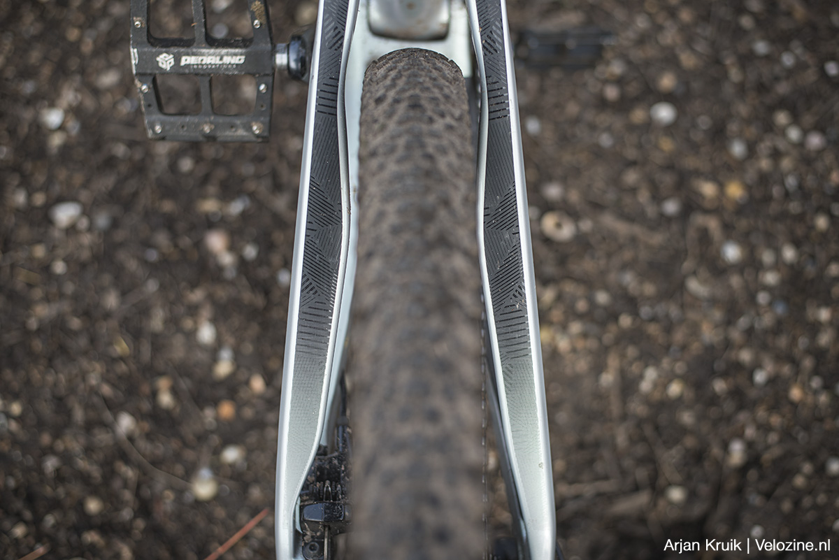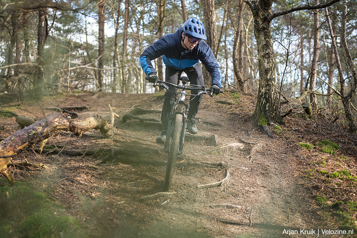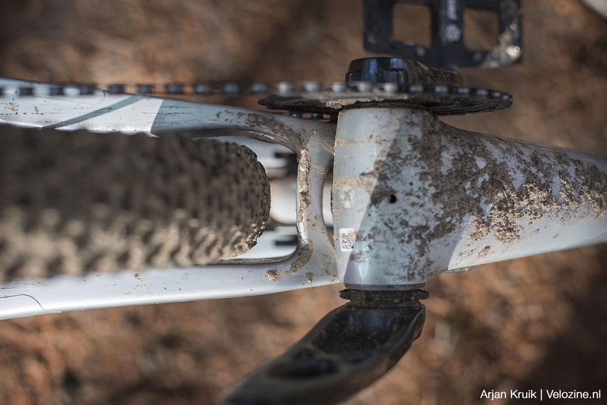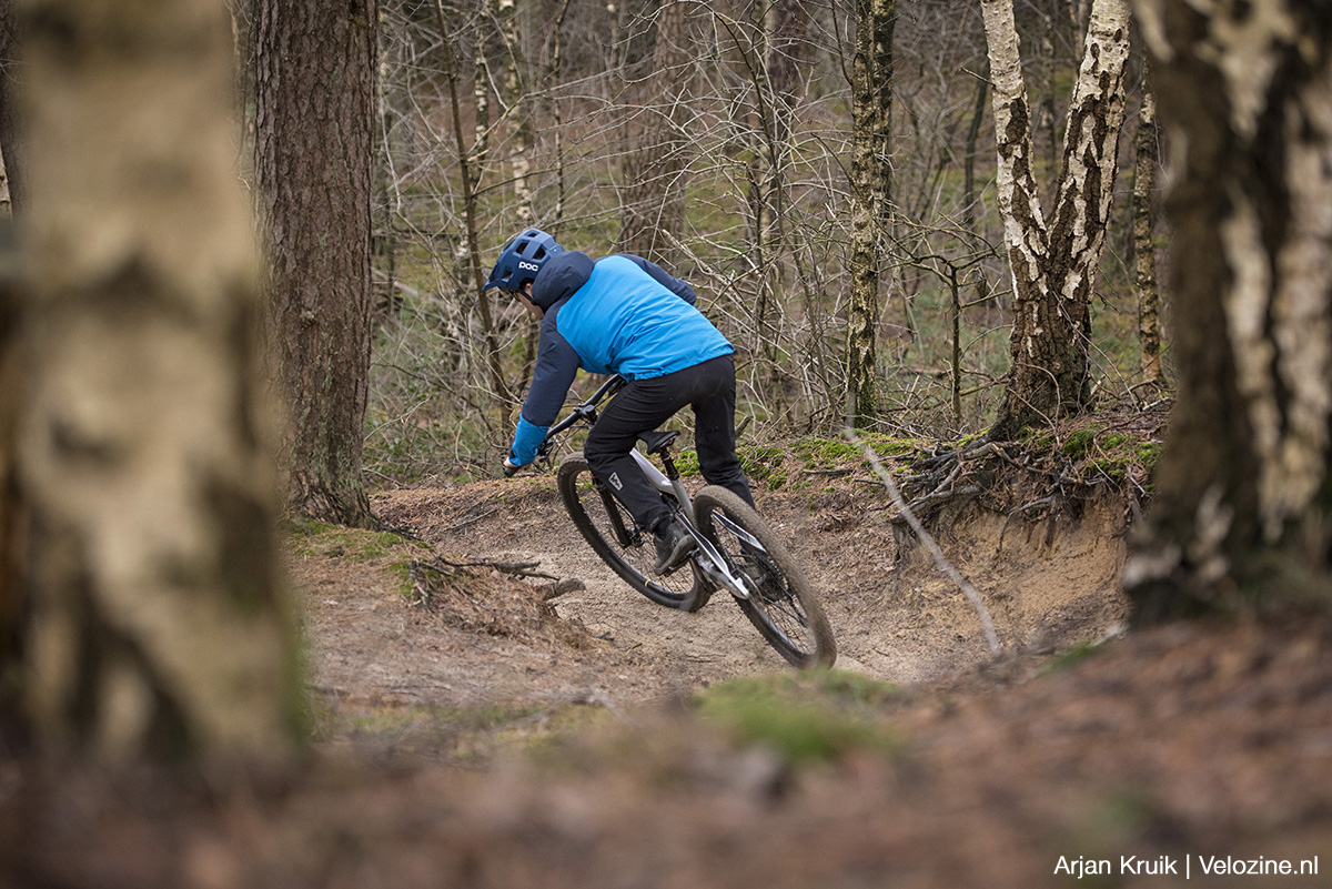 Ik mopperde hierboven over het ontbreken van een klimstand bij de veerelementen, maar de eerlijkheid gebied me te zeggen dat het onderstel van de XRM in de open stand nauwelijks gevoelig is voor deinen. Sterker: hoe harder ik op de pedalen stampt, hoe efficiënter het rijgevoel. De demper zakt in steile passages niet weg, maar reageert wel uitermate fijngevoelig op de ondergrond, waardoor de achterband ondanks z’n ondiepe profiel toch verrassend veel grip weet te vinden. Alleen op de voor Drieluik Dorst zo karakteristieke korte maar steile bulten, die ik voornamelijk staand in de pedalen overmeester, gaat de achtervering zo nu en dan door z’n knieën. Hier zou tussen de open en de gesloten stand een klimstand van pas komen. Immers; als je de vering ‘op slot zet’ lever je in op tractie en comfort. Ik gebruik de lock-out daarom alleen maar op de verbindende asfaltsecties.