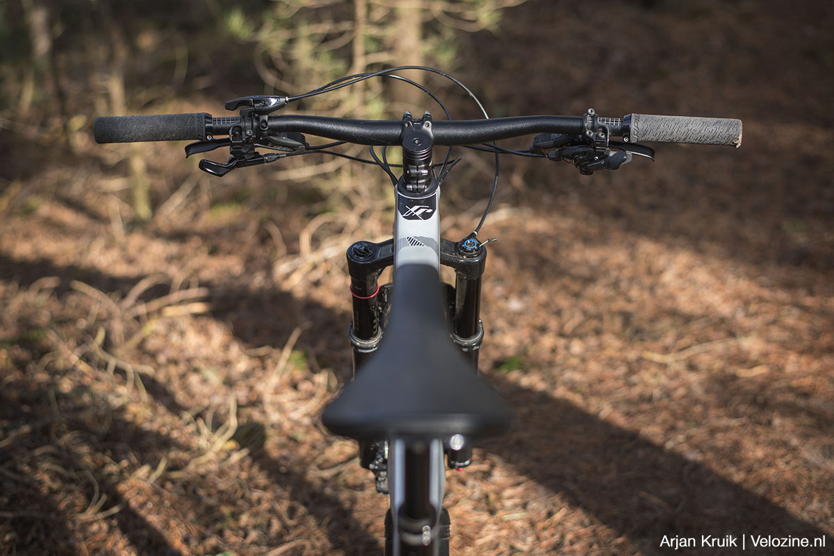 Bij het dalen is het omgekeerde het geval. Je zou het van een bike met zoveel crosscountry-DNA in eerste instantie niet verwachten, maar de Lapierre XRM is een van de best dalende bikes in z’n klasse. De mate van controle en stabiliteit zou op een trailbike niet misstaan. De luie balhoofdbuishoek, die in trage secties zo nu en dan teveel van het goede lijkt, komt in snelle en steile afdalingen volledig tot z’n recht. Hoe sneller en steiler, hoe beter. Niet dat de balhoofdbuishoek daarvoor in z’n eentje verantwoordelijk is. Ook het capabele onderstel speelt een cruciale rol. In het eerste deel van de slag spreken de veerelementen soepel aan, maar al vanaf een derde van de veerweg wordt de veercurve progressiever. Hierdoor ontstaat – ondanks de in vergelijking tot echte trailbikes geringe veerweg – een gevoel van bodemloze vering.