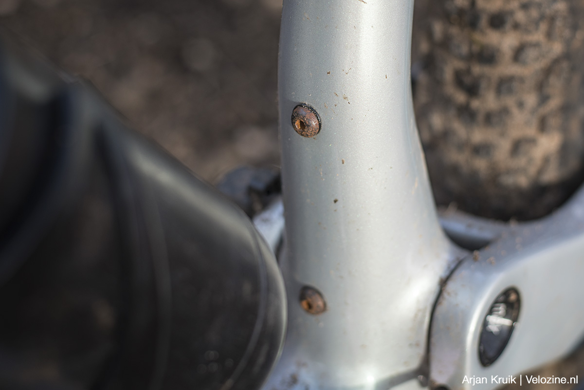 Zoals gezegd heeft onze testfiets maat L. Testrijder Sebastiaan, die je op de foto’s ziet, is 1,78 meter lang. Eventueel zou hij op een frame in maat M passen, maar de L is beter. Voor mij, met mijn 1,80 meter, is de L optimaal. Voor testrijder Henk, die met 1,84 meter niet veel langer is dan ik, maar wel langere benen heeft, blijkt de zadelpen in de maximaal toegestane lengte ruim een halve centimeter te kort. Henk heeft dus een langere zadelpen nodig. Of anders een frame in maat XL.