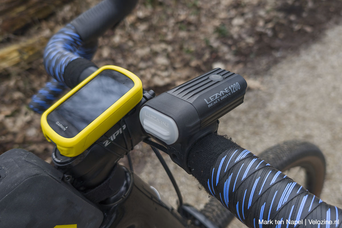 De Lezyne React Drive 1200-koplamp heeft een maximale lichtopbrengst van 1.200 lumen, gevormd door drie grote LED’s met elk hun eigen lens. De lichtbundel is vrij breed en de lichtsterkte neemt heel geleidelijk naar de randen toe af. Hierdoor ontstaat een relatief rustig lichtbeeld, met ruim voldoende nuttig licht voor donkere fietspaden in het buitengebied. Daarbij merk ik wel op dat het witte licht voor mij wel vrij ‘hard’ is; de contrasten bij het rijden op donker asfalt worden flink versterkt, wat ik niet altijd even prettig vind. Precies op dat soort momenten zou het kunnen schakelen naar een iets minder felle stand fijn zijn.