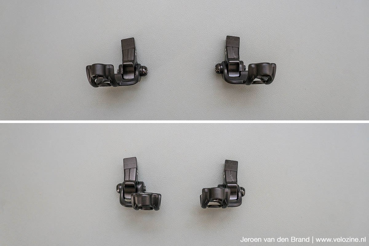 Ook de breedteverstelling nutte ik compleet uit. Dat wil zeggen; bij zowel de shifter als de dropperhendel heb ik ze maximaal naar binnen geschoven tot het einde van de sleuven. En dit komt omdat ik de relatief lange 2-vinger remgrepen van de Magura MT5 eStop remmen dusdanig ver naar binnen heb staan, dat ik ze als 1-vinger grepen bedien. Daaruit volgde ook mijn omgedraaide montageposities van de klemmen. Onder de streep zit ik dus bij beide verstellingen precies op de limieten. Maar als het werkt, werkt het, toch?