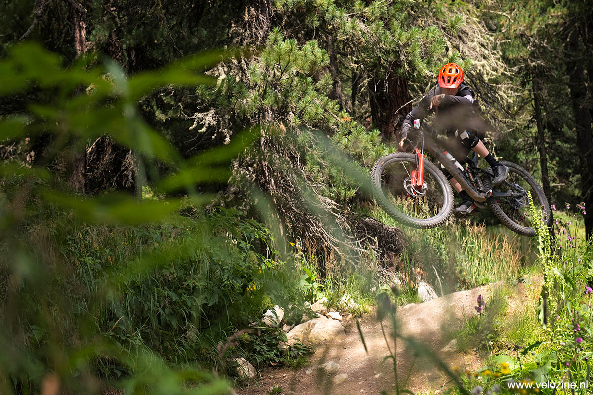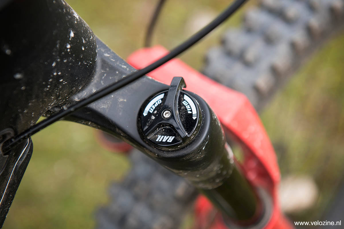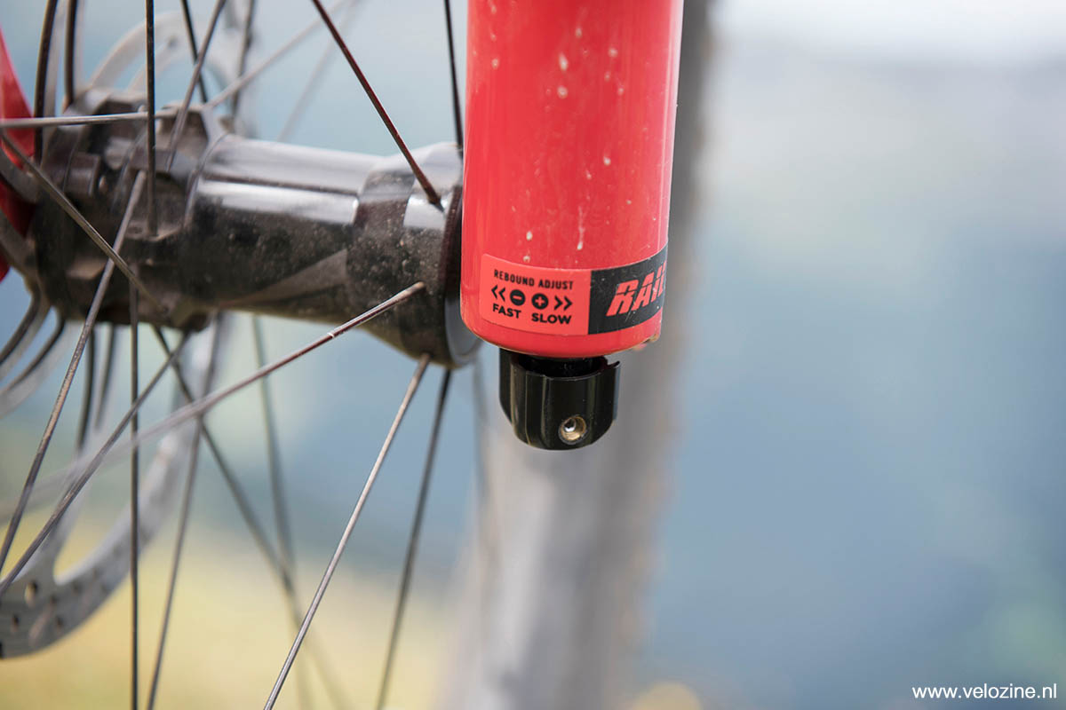 De instelknop van de compressiedemping van de Rail-demper heeft zoals gezegd een traploos verstelbereik van slechts een halve slag. Ik rij in eerste instantie met de compressie geheel open. De vork biedt dan in het midden van de veerweg voldoende tegendruk en gebruikt als het nodig is de beschikbare veerweg. Maar in steile, langzame secties duikt de vork met name bij grote treden té diep in. Door de demper ongeveer driekwart dicht te draaien, biedt ‘ie in dit soort technische secties meer ondersteuning. Echter, omdat ik na zulke stukken telkens vergeet om ‘m weer open te draaien, kies ik er uiteindelijk voor om de knop permanent nét geen kwartslag dichtgedraaid te houden. Een compromis waarmee ik in bijna alle gevallen goed wegkom. Mis ik hier een separate high speed- en low speed-demping? Eerlijk gezegd niet. Easy does it.