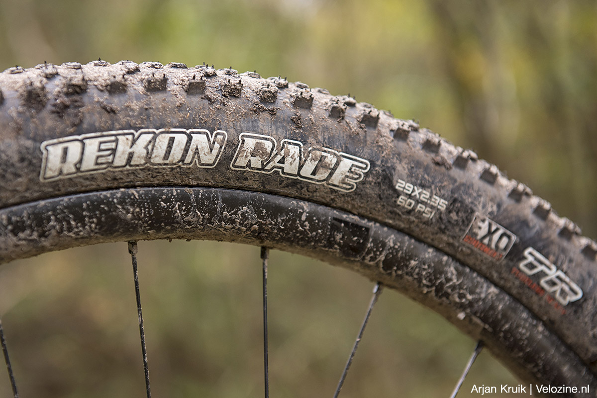 Rondom de velgen ligt een paar 2.35 inch brede Maxxis Rekon Race-banden. Op de Nederlandse zandgrondroutes rijden ze erg fijn, met een gunstige mix van rolweerstand, tractie, bochtengrip en demping. Dan de grens over: in de Ardennen of de Eifel kom je nog wel met de Rekon Race weg. Maar zuidelijker? Ik geef het je te doen, met dat minimalistische profiel en die dunne wangen. Laat ik het zo zeggen: trailwaardig zijn deze snelle Maxxissen niet.