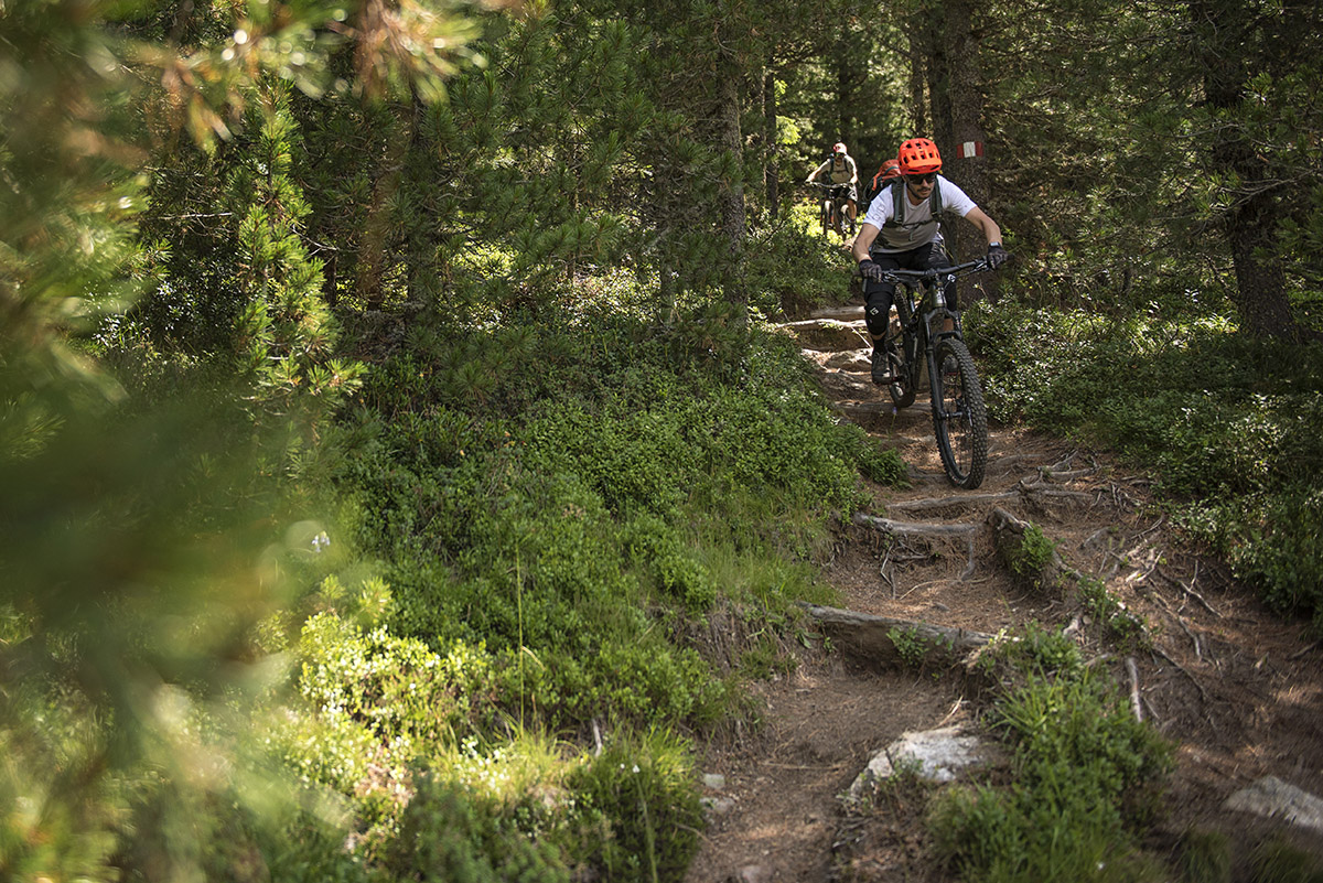 Ik neem de Hochnall-ronde in het Zuid-Tiroolse Pustertal even als voorbeeld, omdat deze tour alles in zich heeft. Check het routekaartje onderaan deze test maar even. De klim begint op asfalt, dat na een paar kilometer overgaat in grind. De zit is rechtop en ontspannen, de ondersteuning soepel en krachtig. In m’n groepje rijden ook e-mountainbikes met motoren van Bosch en Specialized mee. Maar met alle bikes in de dynamische ondersteuningsmodus, bij Shimano de trail-modus genoemd, is het geen probleem bij elkaar te blijven. En de 170 millimeter veerweg rondom? Die zit bij het klimmen over asfalt en schotter totaal niet in de weg.