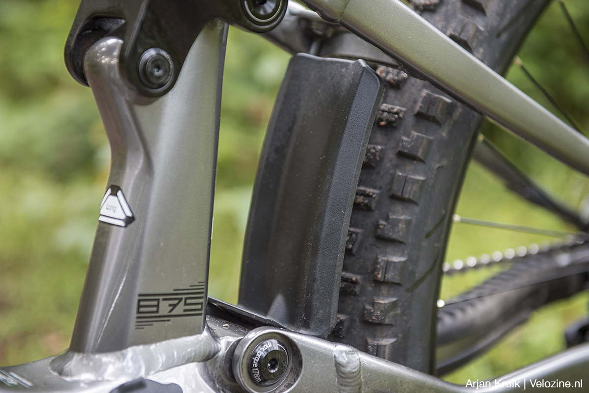 De eOne-Sixty 875 heeft af fabriek een 29 inch voorwiel en een 27.5 inch achterwiel. Oftewel: deze e-bike is een zogenaamde mullet. Als je een flipchip in de hevel omdraait, past ook een 29 inch achterwiel in het frame. De geometrie blijft daarmee min of meer gelijk, maar de veerweg krimpt dan van ruim 170 millimeter naar 160 millimeter. We hebben deze optie niet geprobeerd. Aan de trend van de verstelbare geometrie doet Merida niet mee; wat je ziet is wat je krijgt. Een trend die Merida wél heeft opgepikt is die van de kabelgeleiding door het bovenste balhoofdlager. Om de kabels te beschermen is in het balhoofdlager een stuuruitslagbegrenzer opgenomen.