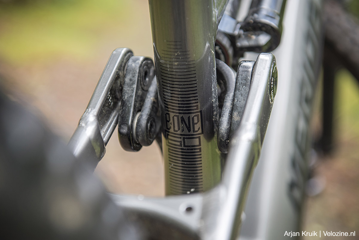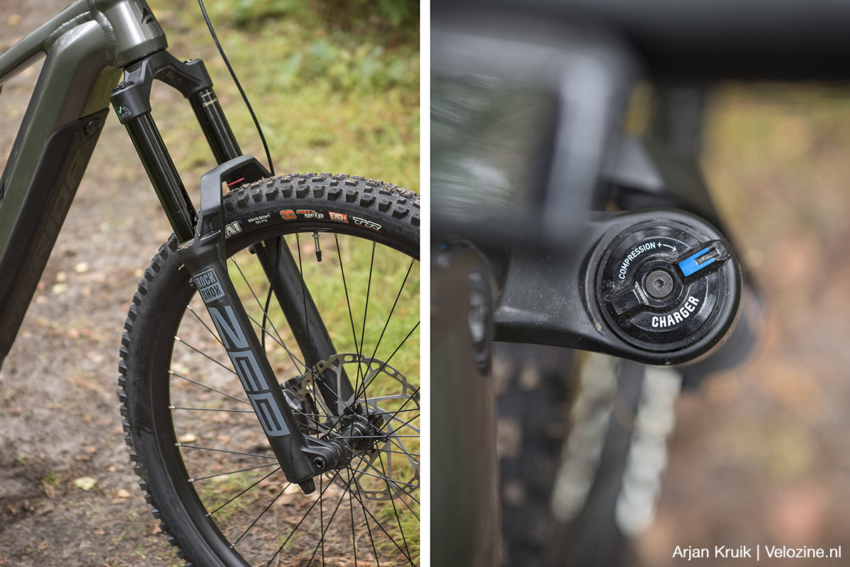 Aan de voorkant strijkt een Rockshox Zeb Select met Charger-demper de ondergrond glad. Laat je ook hier niet afschrikken door het feit dat het ‘maar’ een vork uit de Select-reeks is. De Zeb Select spreekt supersoepel aan en drukt het voorwiel goed tegen de grond, maar zonder daarbij al te diep in z’n veerweg te zakken.