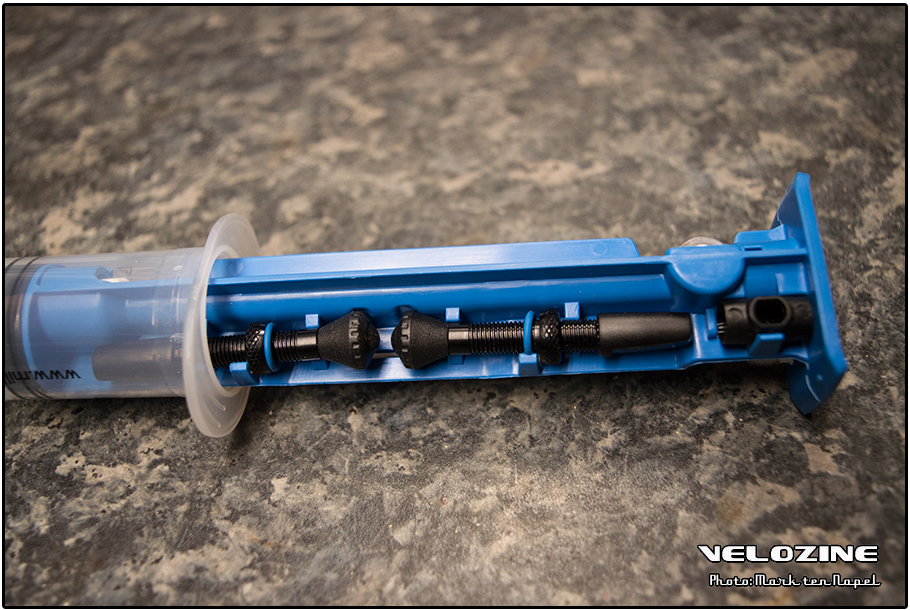 De Milkit tubeless set komt verder met een injectiespuit met daaraan een afsluitbare slang én naald. De punt van de naald is afgeschuind, zodat je hem gemakkelijk door de afdichting kan steken. Het zorgt er ook voor dat de naald niet blokkeert wanneer je hem tot de binnenkant van (het loopvlak van) de band doordrukt. De afdichting dicht vervolgens nog voldoende langs de naald af, zodat er niet of nauwelijks druk van de band ontsnapt. En druk in de band is zelfs nodig – of op zijn minst handig – om de set tot zijn volle recht te laten komen.