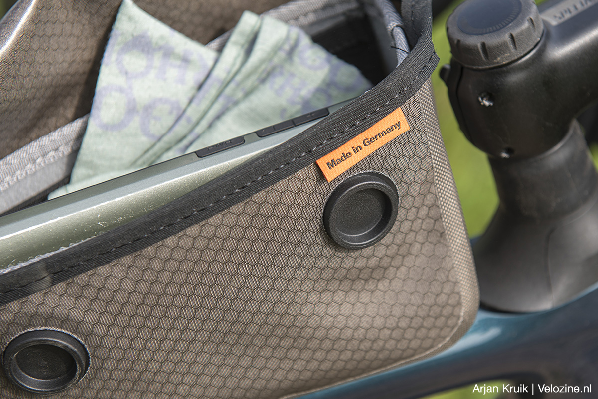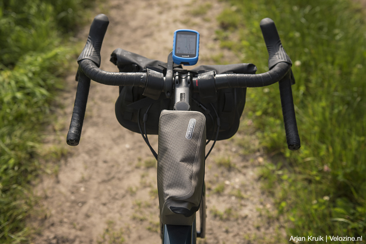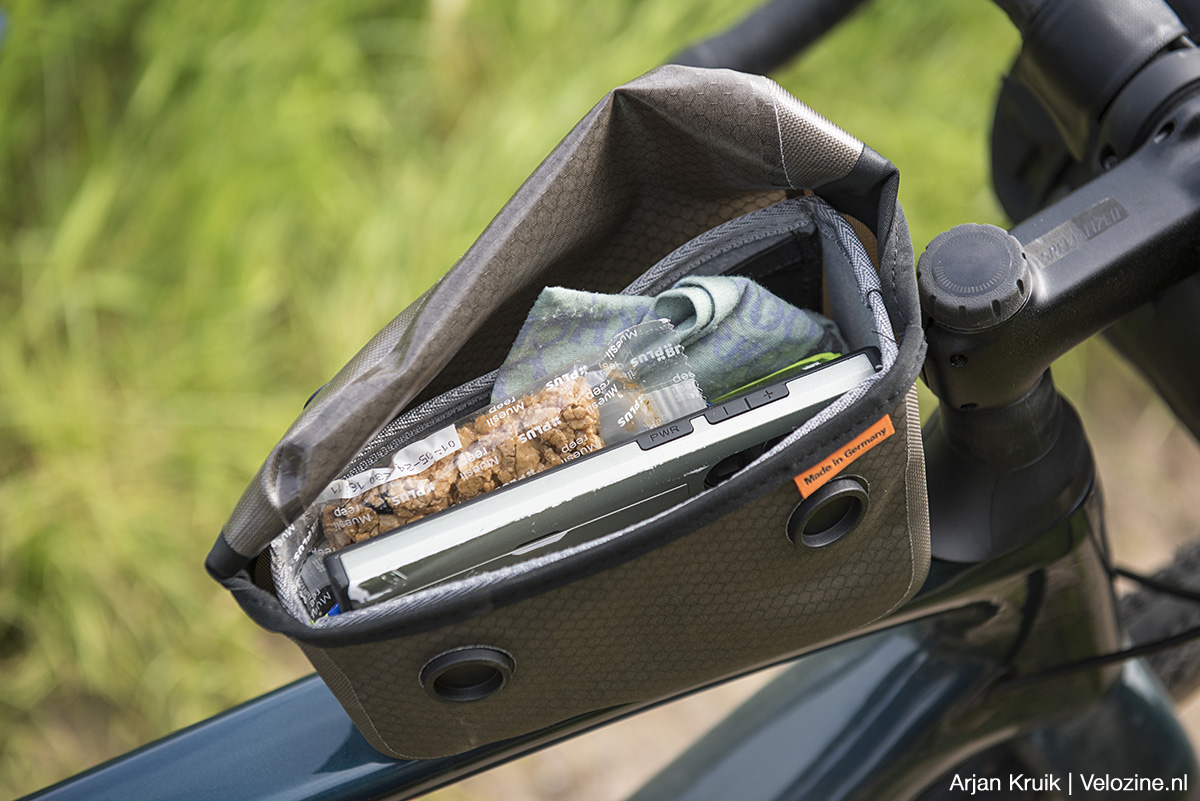 Naast de bekende waterdichte tassen van glimmend dekzeildoek in opvallende kleuren, maakt Ortlieb ook lichtgewicht bikepacking-tassen. Afgelopen jaar hebben Sebastiaan en ik er een hele zwik getest. Eigenlijk bevielen alle tassen goed, met uitzondering van de bovenbuistas Cockpit-Pack. De montage was omslachtig, de knieën raakten tijdens het fietsen de zijkanten en bovendien liet de Cockpit-Pack zich niet monteren op bovenbuizen met speciale nokjes voor dit soort tasjes. Daarnaast was het vanwege de horizontaal geplaatste, stroeve waterdichte rits ondoenlijk om er tijdens het fietsen iets uit te halen. Áls je het er al in kreeg, want vanwege z’n vreemde, welvende vorm paste niet alles er even goed in.