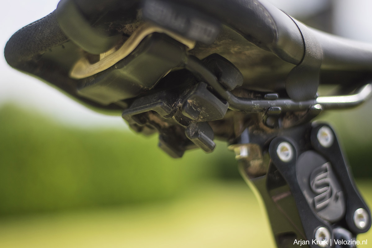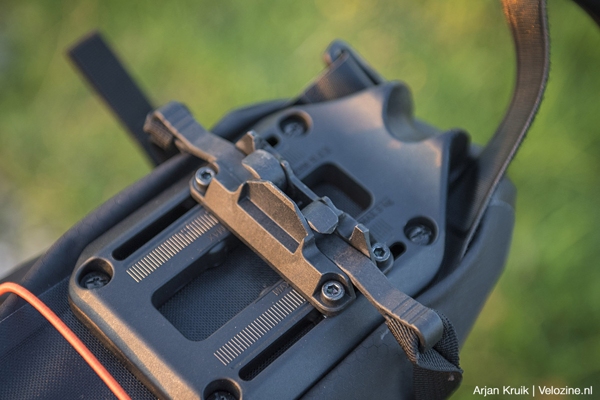 En dan is er natuurlijk nog de snelkoppeling. Het systeem bestaat uit twee kunststof haakjes die over de rail van het zadel vallen, waarna ze door middel van spanbandjes gefixeerd worden. Om de tas weer los te maken haal je de spanning van de bandjes af en druk je de haken weer omhoog. Simpel en effectief. Althans, áls het werkt. Bij het zadel op de testsfiets – een Fizik Argo Terra – krijgen we het systeem niet goed werkend. De haakjes willen niet over de rail vallen, ondanks dat we gebruik maken van de mogelijkheid om de positie in een verticaal vlak te verstellen. Ook bij een SQlab-zadel lukt het monteren niet. Pas bij het derde zadel, een Specialized Bridge, werkt de snelkoppeling naar behoren.