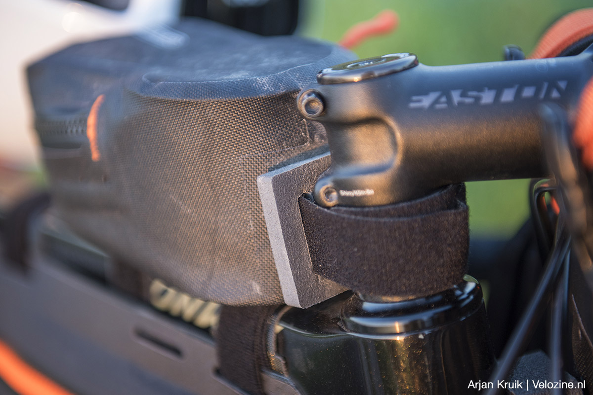 De Cockpit-Pack is een waterdicht bovenbuistasje. Ook hier weer de mix van van stevig nylon weefsel en lichter ripstop. De rits is waterdicht, maar in iets mindere mate dan de Ortlieb Frame-Pack Toptube. Achter de rits is daarom een een extra barrière aangebracht om water dat tóch door de rits weet te dringen tegen te houden: zo blijven telefoon, powerbank en energierepen altijd droog. Je monteert het tasje met twee klittenbandjes, waarvan de onderste zich dankzij een keerlus extra goed laat spannen. Puntje van aandacht: het holle contactblokje matcht niet altijd even goed met de platte bovenbuizen van veel moderne carbon frames. Aan de voorkant houdt een blokje schuim het tasje en de stuurpen uit elkaar, om schuurplekken te voorkomen. Ziet er een beetje houtje-touwtje uit, maar is wel functioneel.