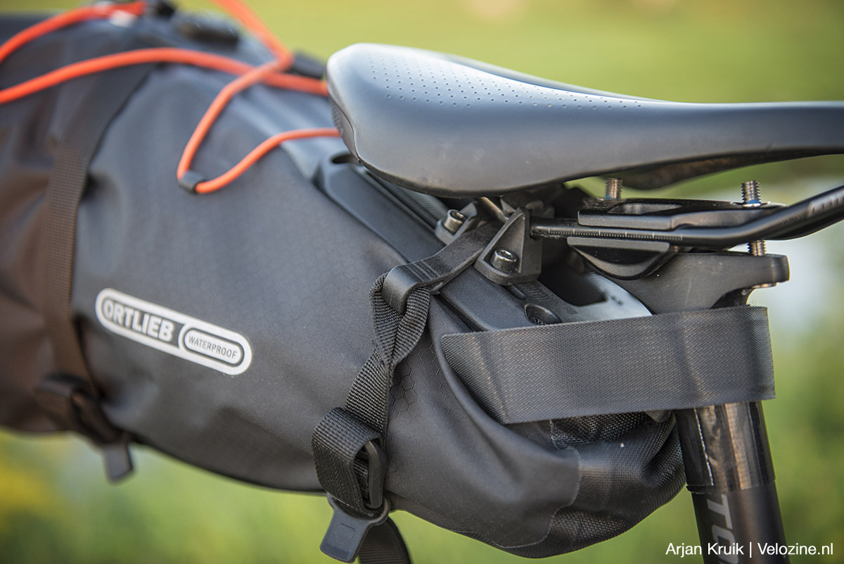 Het fietsen dan. Mijn aanname was altijd, dat de zadeltas zo populair was omdat-ie zo lekker fietst. En ja, op vlakke wegen en paden zit zo’n tas niet in de weg. Maar ga je het terrein in en wil je met je billen naar achteren om een heuveltje af te rollen, dan kan zo’n ‘frietzak’ flink in de weg zitten. En van die twee compacte en lichte ‘mini-krantentassen’ achterop de bagagedrager heb je juist geen last. Rammelen dan? Dat is bij geen van beide combinaties een probleem. Tégen de verwachtingen in trouwens, want ik had verwacht dat de achtertassen flink zouden schudden. Maar vanwege de ruime hoeveelheid contactpunten zitten die achterassen rammelvrij aan de drager. Plus: het zwaartepunt van de achtertassen zit laag, dat van de zadeltas hoog. Ook hier is de klassieke opstelling dus zo gek nog niet.Lang verhaal kort: als ík een lichtgewicht Ortlieb Bikepacking-set voor eigen gebruik zou samenstellen, dan zou ik voor de klassieke variant met achtertassen gaan. Eigenlijk exáct zoals we ‘m geprobeerd hebben. Mocht ik dan meer pakvolume nodig hebben, dan kan ik altijd nog een frametas(je) monteren. Of twee vorktassen. Dat is een combinatie van Ortlieb die we helaas niet geprobeerd hebben, maar die, afhankelijk van het model, zomaar 4 tot 6 liter extra pakvolume oplevert! Maar goed, dat is mijn voorkeur. En wellicht ben ik vanwege een verleden als vakantiefietsers wat bevooroordeeld ten aanzien van het gebruik van achtertassen. Wil je zelf gaan bikepacken, dan raad ik je aan eerst wat tassen te proberen. Dat kan tegenwoordig vrij makkelijk, want er zijn allerlei partijen die Ortlieb-bikepacking-tassen in de verhuur hebben.