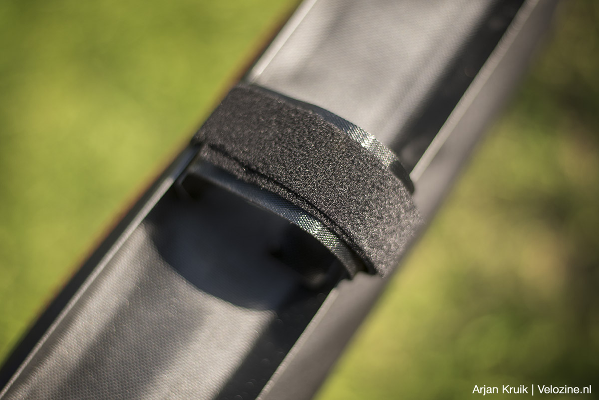 Binnenin vind je één groot vak, de tas is niet gecompartimenteerd. Dat spaart gewicht, maar je mist daardoor wel een opbergplekje voor kleine dingetjes. De montage met klittenbandjes is makkelijk en verzorgd; onder de klittenbandjes zijn namelijk extra, iets bredere nylon bandjes aangebracht die de kans op schuurplekken verkleinen. Om te bepalen of de tas past in je frame heeft Ortlieb een sjabloon op z’n website geplaatst, dat je kunt uitprinten en in je frame kunt plaatsen.
