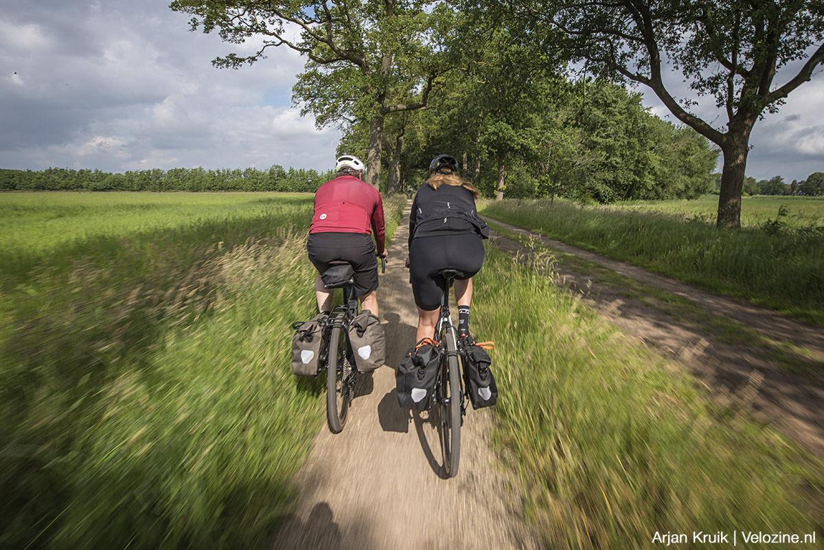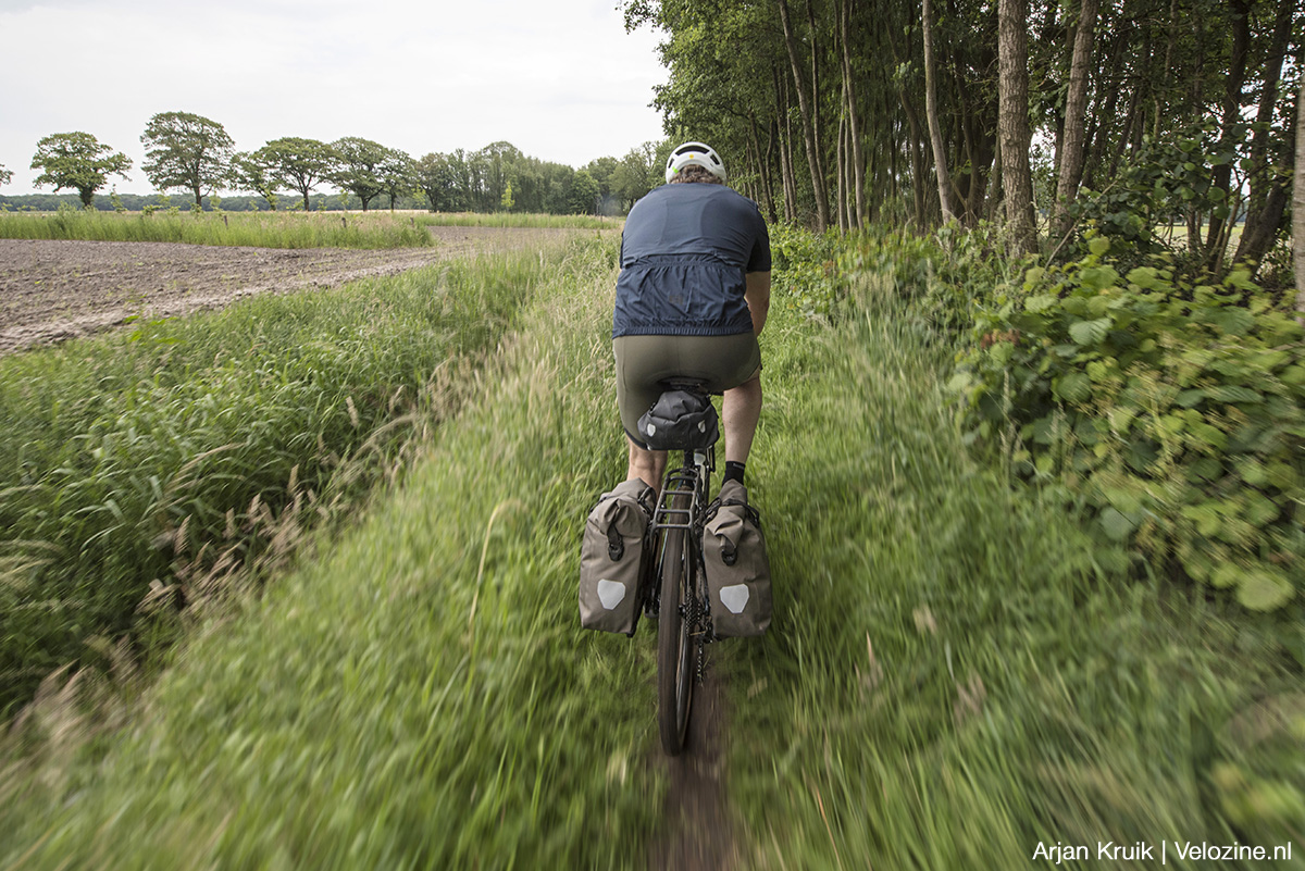 Ook onze driedaagse ronde door de Achterhoek is zo’n tocht. Alles bij elkaar weegt m’n bagage niet meer dan vijftien kilo. Ik kom dus niet aan maximale gewicht van twintig kilo dat volgens Ortlieb aan een Quick-Rack gehangen mag worden. Hoe de drager zich met maximale belading houdt kan ik dus niet zeggen, maar mijn vijftien kilo zijn in ieder geval geen probleem. Of ik nu staand in de pedalen steile klimmetjes overmeester of omzichtig over ruwe wortelpaden aan het manoeuvreren ben, de lichte Ortieb-drager is er niet van onder de indruk. Ik moet je eerlijk zeggen dat ik dat niet had verwacht. Net zomin overigens als ik verwacht had dat de carbon achtertrein van m’n lichtgewicht Specialized Diverge zo vormvast zou zijn.
