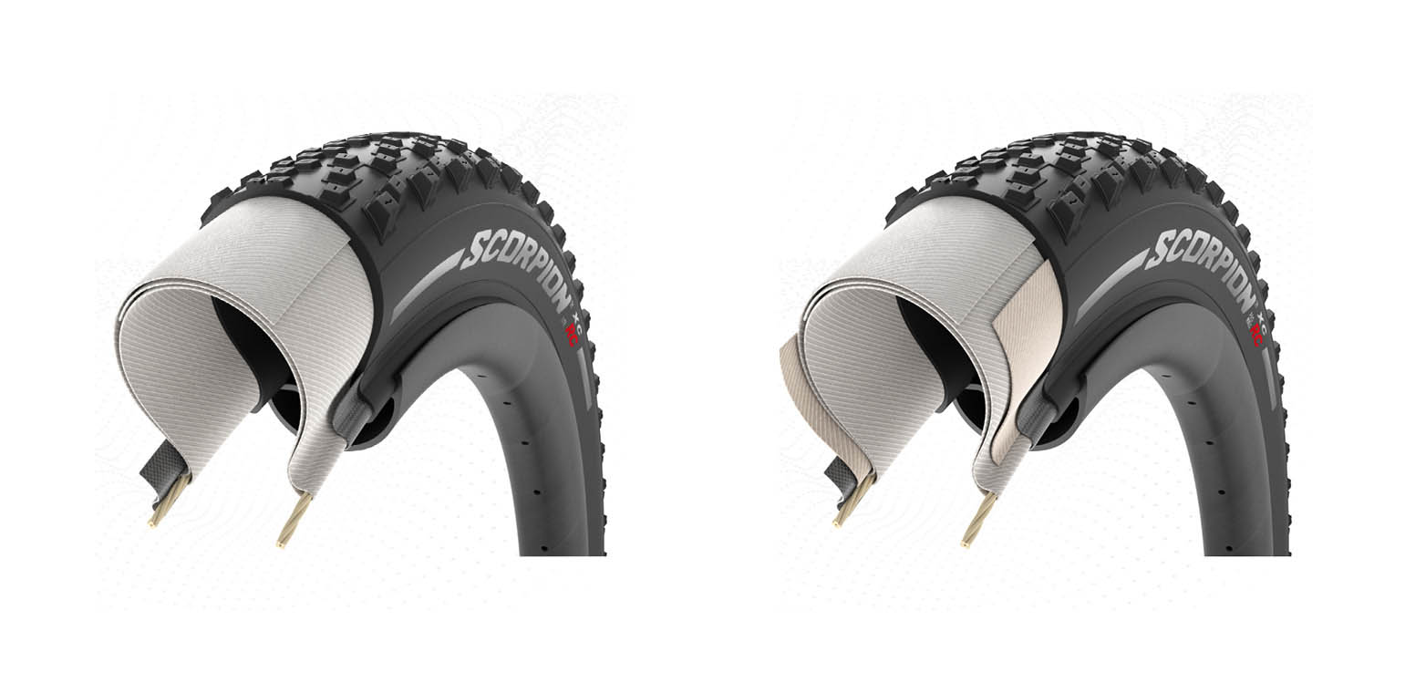 Alle Pirelli Scorpion XC banden zijn verkrijgbaar met een Lite of ProWall karkas. Beide smaken gebruiken 120 tpi nylon als basis, waarbij de ProWall versie aan de zijkanten een extra nylon beschermingslaag tegen snakebites en sneetjes heeft. De lichtste Scorpion XC RC 2,2″ weegt 610 g in Lite editie — ProWall voegt 50 g toe. De minst subtiele Scorpion XC is de S in 2,4″ breedte, met ProWall goed voor 830 g. De Lite versie is 90 g lichter.