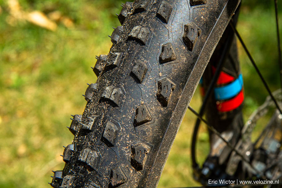 Toen Pirelli enkele testbanden aanbood zaten we midden in een hard oplopend neerslagtekort. Iedere route nabij was op z’n best een driftfestijn met een losse toplaag, en op z’n ergst één grote mulle bende. Zodoende viel mijn aanvankelijke keus op een 2,2″ Scorpion XC S als voorband — omwille van het agressieve, grove profiel — gecombineerd met de veel subtielere, op rolweerstand gerichte 2,2″ Scorpion XC R achter. Het verschil in profiel is uiteraard vrij groot: Waar de S grote, ver uit elkaar staande noppen heeft met een hele duidelijke richting, zijn die van de R klein, kort en bijna symmetrisch. Bijna, want de noppen van iedere tweede rij op het loopvlak hebben toch een schuin kantje in de rijrichting. Dit verlaagt de rolweerstand — een techniek die bij de hogere noppen van de S ook overal gebruikt wordt. Opvallend bij beide modellen is de siping — versnijding — in alle noppen: loopvlak, zijnoppen en de middenrij. Dat sneetje zorgt voor net wat meer bewegingsvrijheid van de nop en daardoor een klein beetje extra grip op (natte) stenen en wortels.