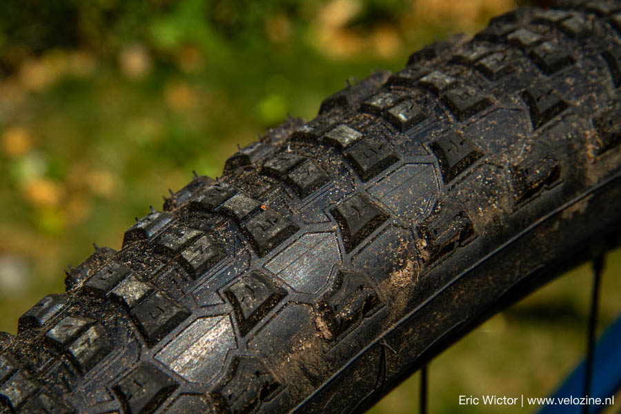 De Scorpion XC R is voor de meeste Nederlandse omstandigheden een prima achterband, die het nagenoeg overal bij kan benen. Als het echt té nat/glad wordt heeft het ondiepe loopvlak wat moeite met kiezels, wortels of balkjes. Klimmend gaat tractie uiteindelijk verloren, ongetwijfeld geholpen door de schuine opstaande randen van de (midden)noppen. Remmen gaat echter prima, omdat die schuine randen aan de achterkant van de noppen natuurlijk ontbreken. Al met al niks onverwachts en ook niet echt hinderlijk, tenzij je op zoek gaat naar klei of worteltapijten. Wat me wel verraste is dat de Scorpion XC R lang niet zo snel voelt als ik van het lage profiel en ogenschijnlijk harde rubber had verwacht. Mogelijk ligt dit aan het karkas: ook de Scorpion XC R is een ProWall versie, terwijl mijn ‘eigen’ achterband normaliter een Maxxis Ikon TR is – zónder het versterkte EXO karkas. Een steviger karkas rolt simpelweg wat zwaarder… Maar gaat ook minder snel lek. Tot op heden heb ik dan met beide genoemde Scorpions ook nul problemen gehad.