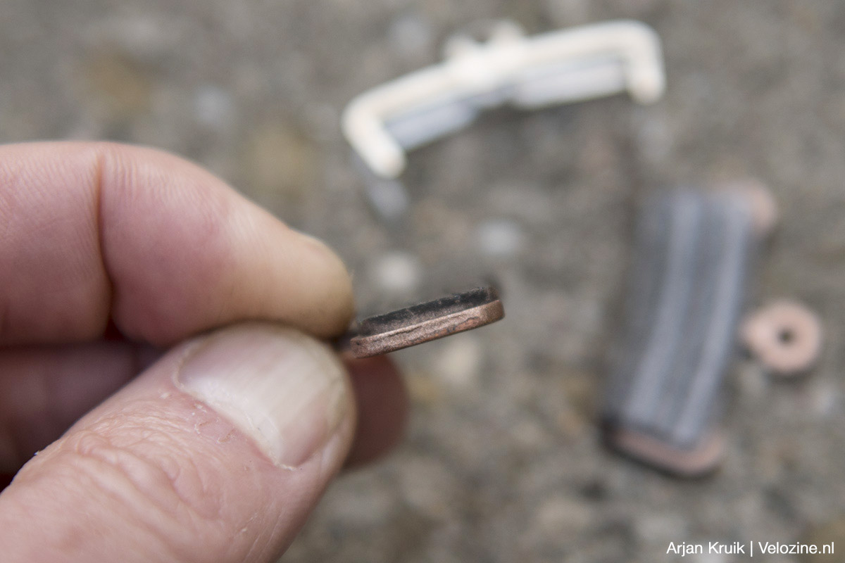 Na afloop van de Stoneman Miriquidi en nog wat extra rondjes over de mtb-paden van Trailcenter Rabenberg, bij elkaar zo’n 250 kilometer en 5.000 hoogtemeters onder zo nu en dan zeer natte omstandigheden, heb ik de dikte van de remschijven en -blokken gemeten. Eerst de schijven. Nieuw zijn die 1,80 mm dik, gebruikt voor en achter respectievelijk 1,69 mm en 1,67 mm. Aangezien BBB adviseert de schijven bij een dikte van 1,60 mm te vervangen, zit ik qua slijtage dus al over de helft. Dan de DiscStop HP Organic-remblokken. Nieuw meten die 3,87 mm, na de Stoneman is daar aan de voorkant nog 3,61 mm en aan de achterkant 3,58 mm van over. Ook hier ben ik dus ongeveer op de helft.