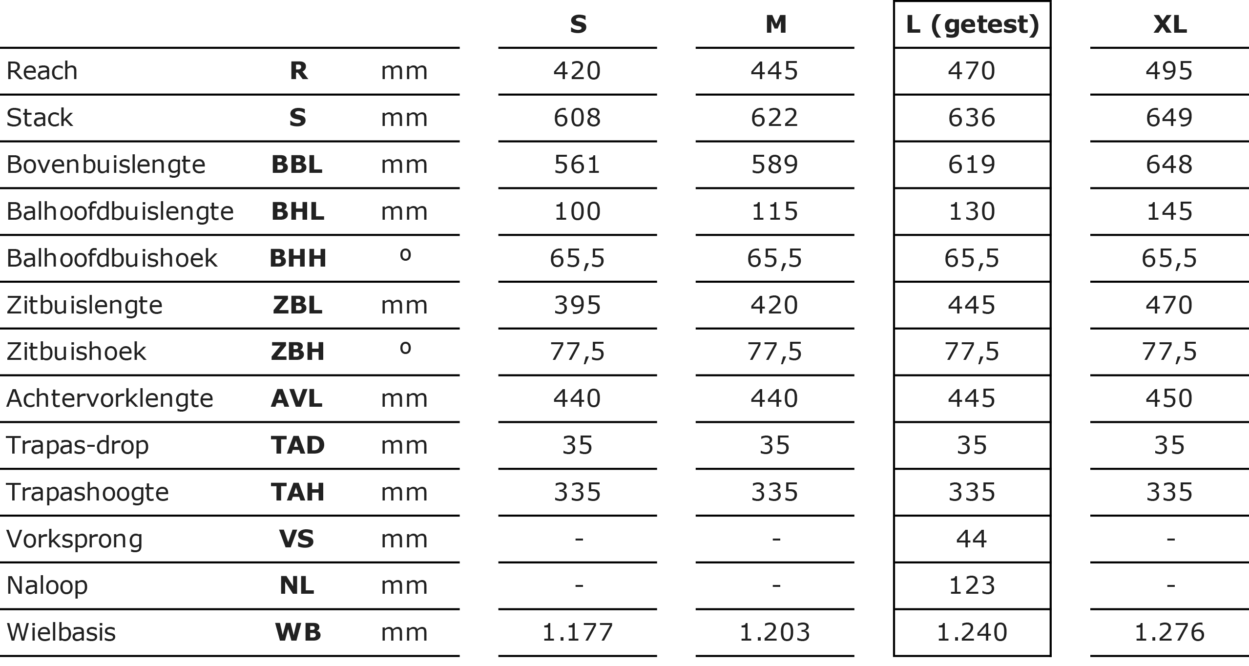 | Gewicht compleet | 15,45 kg (framemaat L, met onderdelen zoals getest) |