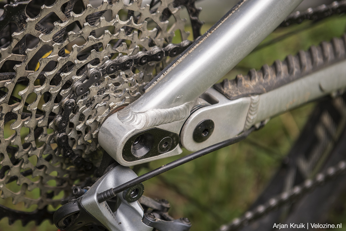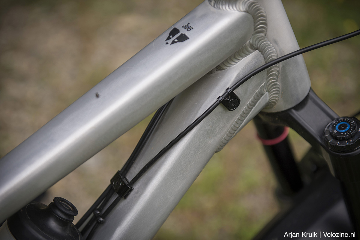 Los van de rijeigenschappen is ook het frame op zich een plaatje, met strak laswerk, een robuuste constructie, solide lagering en doordachte details. En dan is er nog dat kale, onbewerkte aluminium. Fraai! En als je daar anders over denkt, dan is er natuurlijk altijd nog de zwarte uitvoering. Wat je natuurlijk niét ziet is het hoge gewicht. Soit, dat is nou eenmaal wat het is. Ik heb er zelf geen problemen mee, de invloed van het gewicht op de rijeigenschappen is echt veel geringer dan je zou denken. Okay, behalve als je de fiets moet dragen, dan is het wel even slikken. Dan de prijs: 2.390 euro voor een los aluminium frame is niet niks. Maar of het teveel is? Ik denk van niet. Gezien de kwaliteit krijg je er vele jaren mountainbikeplezier voor terug.