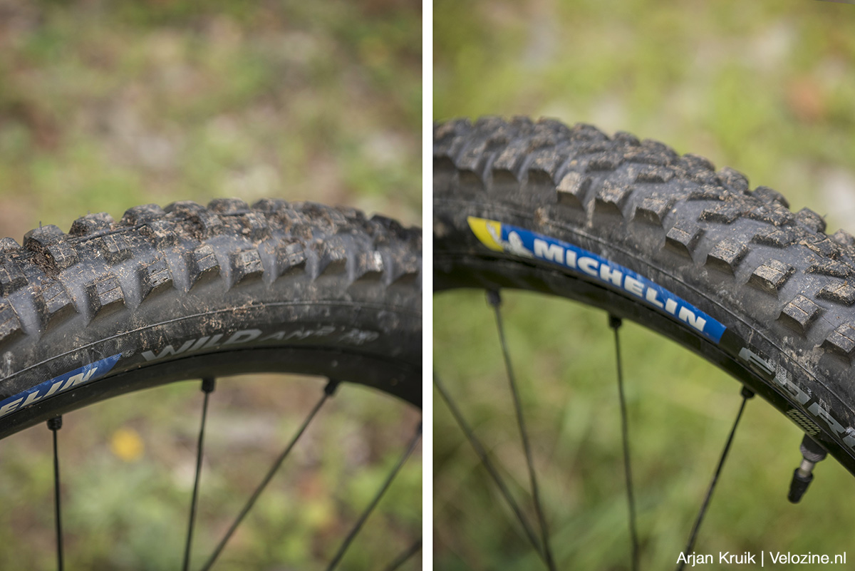 Net als de wielen lagen ook de banden ergens achterin in de werkplaats te wachten op een testfiets. Nou is het net alsof we bij Velozine omkomen in de testbanden, maar dat is het niet. Het is eerder zo dat we voornamelijk xc-spul testen. En zo nu en dan iets downcountry-achtigs. Want wees eerlijk, dikke trailbanden gaan in Nederland nou niet bepaald als warme broodjes over de toonbank. En de banden waarover ik het hier heb zijn precies dát: dikke trailbanden. Een Michelin Force AM2 2.40 inch voor achter, een grover genopte Michelin Wild AM2 2.40 inch voor rond het voorwiel. De weegschaal wordt er niet blij van, ze wegen elk rond een kilo, maar rijden doet dit setje ronduit goed.