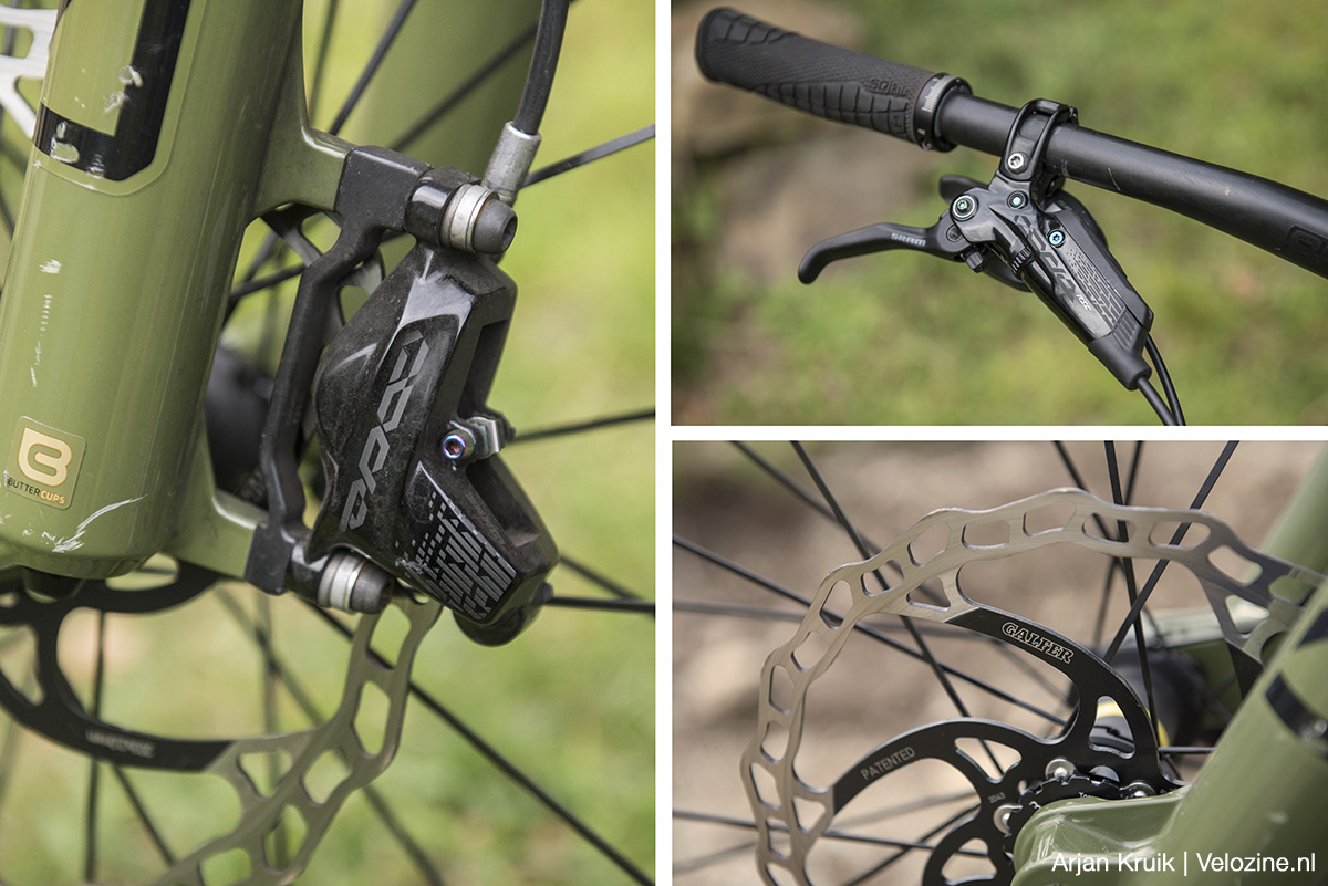 De remmen op de Jibb zijn Code’s van Sram. Dat zijn krachtige, maar tegelijkertijd goed te doseren stoppers. Ik heb echter niet Srams nieuwe, 2 millimeter dikke HS2-remschrijven gebruikt. Reden: de achterste remklauwadapter op de Jibb is alleen geschikt voor schijven van 203 millimeter, terwijl de Sram-schijven een diameter van 200 millimeter hebben. Ik weet het, de bike-industrie is gek. Maar als je zelf een bike opbouwt, heb je er wel mee te dealen. Ik heb daarom 203 millimeter remschijven van Galfer gemonteerd, die zijn net als de HS2’s dikker dan gebruikelijk. En ze doen het goed. Je leest er meer over in het testverslag dat we hier onlangs publiceerden. Nog even over de schijven: de Jibb komt dus standaard met een 203 millimeter achterremschijfadapter. Wil je een kleinere schijf, dan moet je de optionele 180 millimeter adapter bestellen. Maar waarom zou je kleiner gaan als groot ook past?
