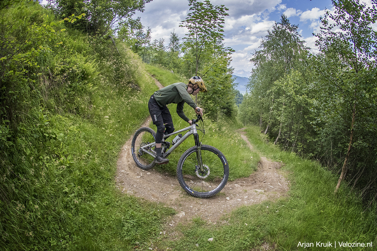 Op die Como-trails wordt nog duidelijker dat de Jibb over een geheel eigen karakter beschikt. Bij veel trailbikes moet je je lijnen zorgvuldig kiezen, de veerweg is immers beperkt. Het positieve daaraan is dat je vanwege de tegendruk die de vering geeft, makkelijk overal overheen hopt. Ondanks dat ook de Raaw Jibb een relatief beperkte veerweg heeft, rijdt-ie toch anders. Het is veel meer een mini-enduro dan een poppy trailbike. Voor mij persoonlijk is dat een plus; je kunt met deze Raaw namelijk echt ongenadig hard naar beneden, zónder afgestraft te worden. Niet solide, maar supersolide. Ja, je moet er dan wel écht voor gaan. Maar doe je dat, dan kun je met deze bike boven jezelf uitstijgen. Althans, dat gevoel heb ik op de Jibb. Dat ik een betere biker ben dan ik ben. En dat voelt goed.