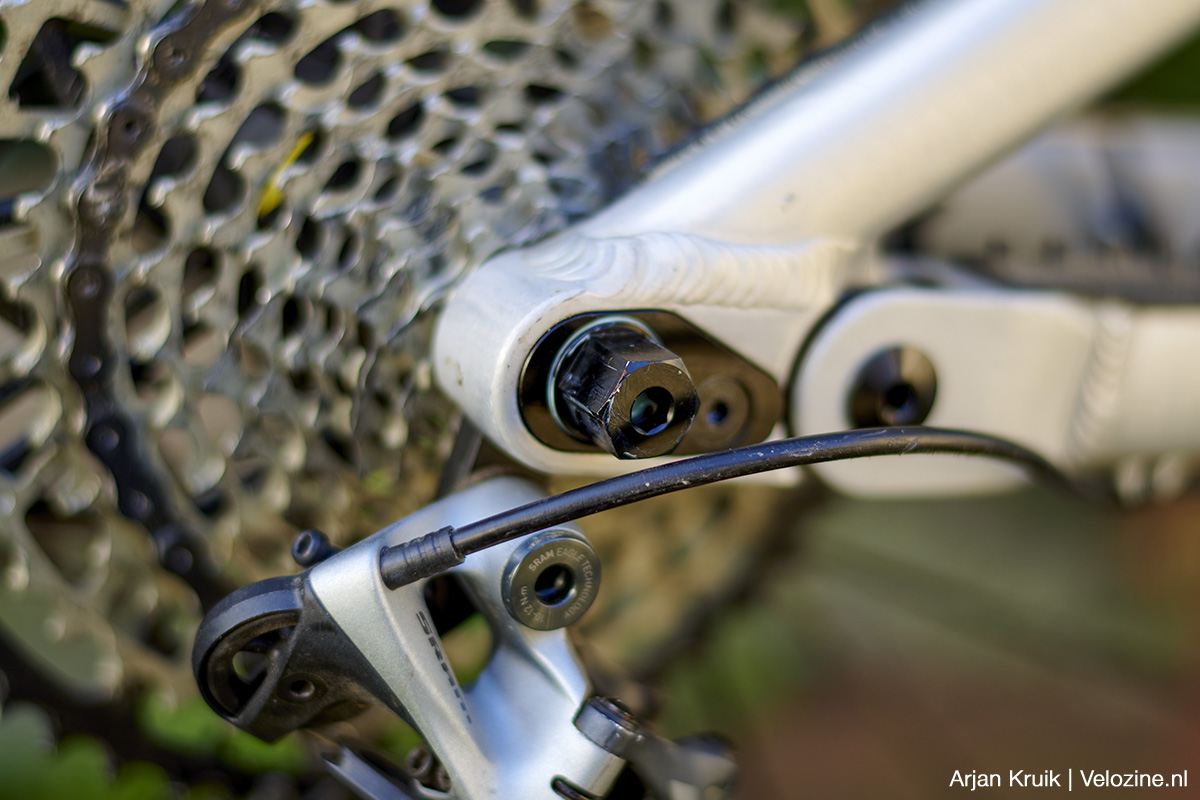 Vanwege de coronatekorten zijn de onderdelen een beetje een samengeraapt zooitje. Maar wel een goéd samengeraapt zooitje. Een Sram X01-derailleur verzorgt samen met dito schakelaar en ketting het schakelgebeuren. Het is mijn ervaring dat X01-onderdelen erg lang meegaan. Dat mag ook wel voor wat ze kosten, vooral de cassette is prijzig. Maar goed, omdat die niet leverbaar was, ben ik sowieso teruggevallen op een alternatief: een 12-speed cassette van Garbaruk. Die is ook grotendeels uit één stuk staal gefreesd, ook uitgevoerd met 10/52-vertanding en net zo licht, maar minder duur; zeker zo’n honderd euro.