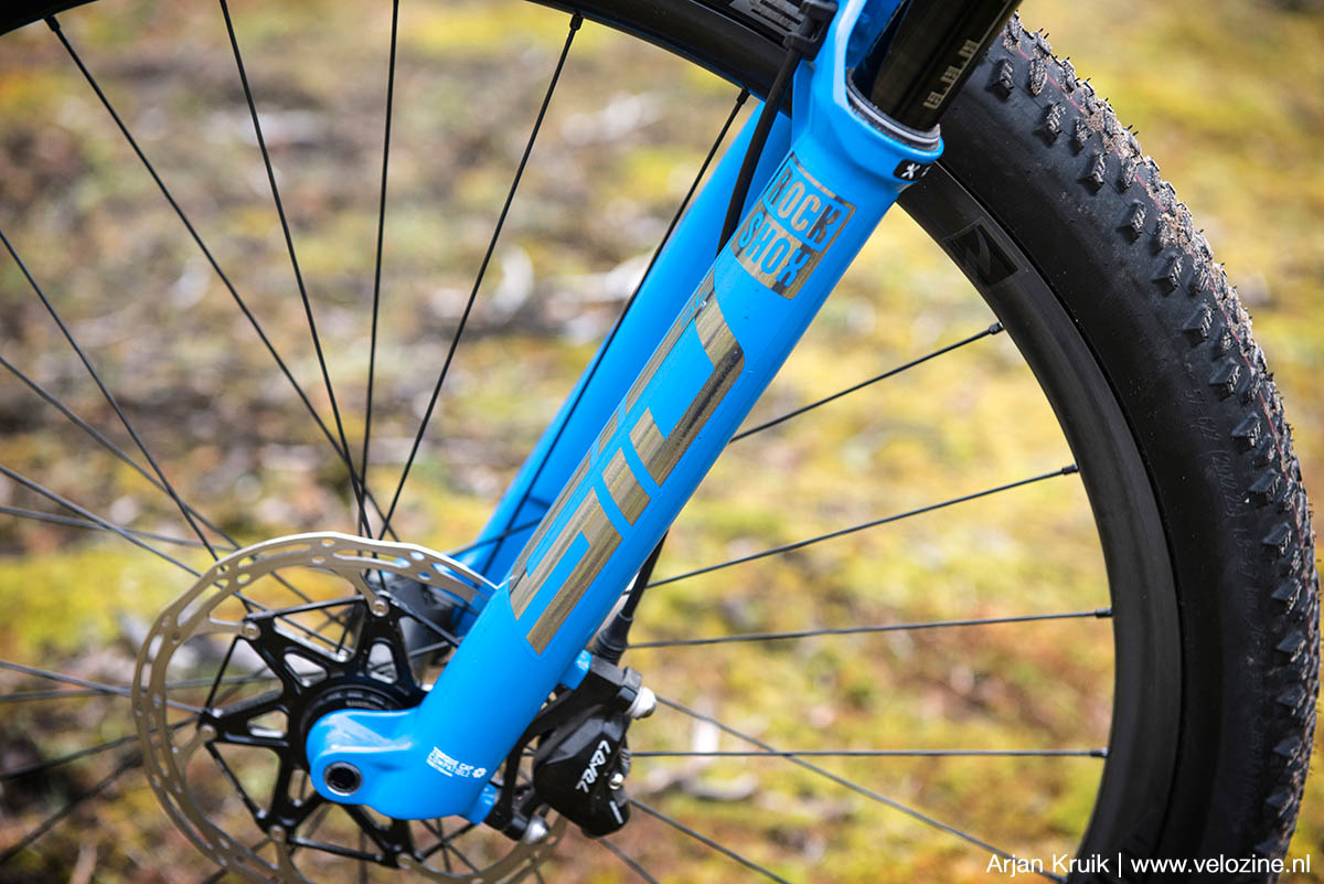 Naast het strakke en lichte carbon frame steelt ook RockShox' SID SL Ultimate-voorvork de show. Niet alleen vanwege de in het oog springende kleur, maar vooral ook vanwege z’n kwaliteiten. Ondanks dat-ie maar net iets meer dan 1.300 gram weegt, zijn z’n prestaties namelijk groots. Collega Jeroen schreef het al eerder in z’n review van deze vork en ik kan het hier alleen maar beamen: de huidige SID SL Ultimate is dé referentie als het om lichtgewicht xc-vorken gaat. Hij spreekt voor een xc-vork ongekend soepel aan, dempt ook op hoge snelheden zeer goed en slaat bij grote klappen niet door. En bij dit alles is-ie stijver dan z’n grote concurrent: de Fox 32 SC.