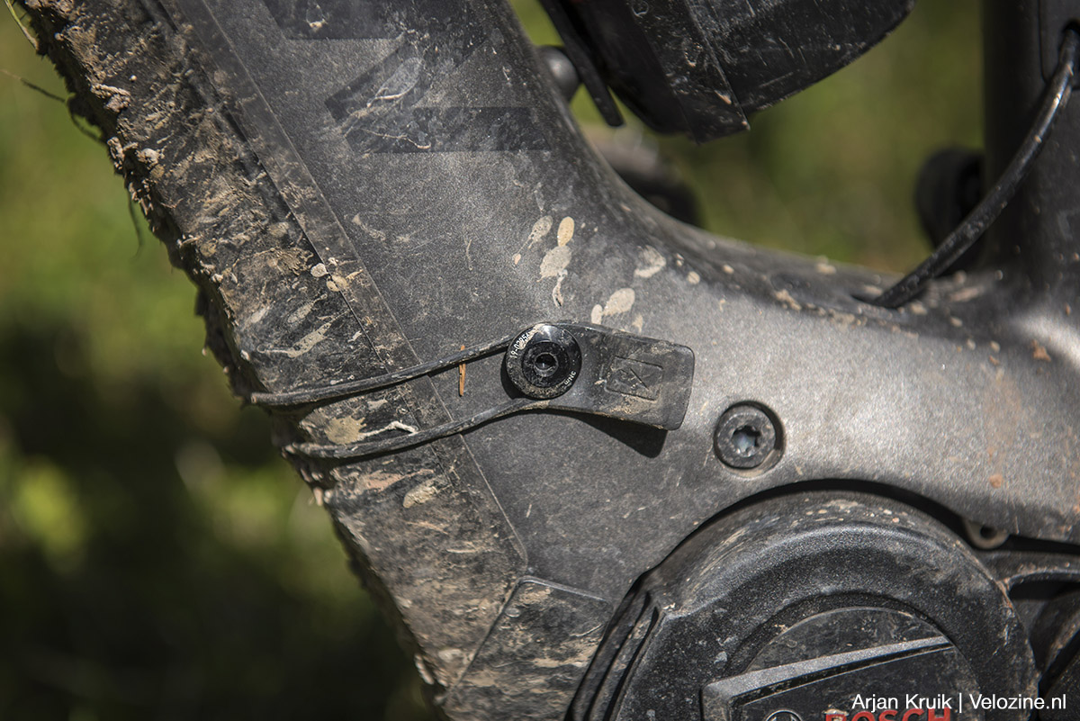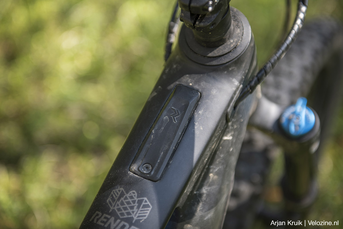 Om de prijs te drukken past Radon een trucje toe dat je ook regelmatig ziet bij het eveneens Duitse Cube: een voorframe van carbon met een achterdriehoek van aluminium. Niks mis mee, het geringe nadeel van een iets hoger gewicht weegt wat mij betreft uiteindelijk minder zwaard dan het voordeel van een lagere prijs. Optisch onderscheidt het frame van de Radon Render zich door de diagonale verbinding tussen de boven- en onderbuis, die niet alleen als bevestigingspunt voor de horizontaal gepositioneerde demper dient, maar tevens het frame extra verstevigt. Niet verkeerd, want net als bij veel andere e-mountainbikes is de onderbuis vanwege de uitneembare accu geen echte buis, maar een iets minder stijf U-profiel, dat is afgedekt met een kunststof klep.