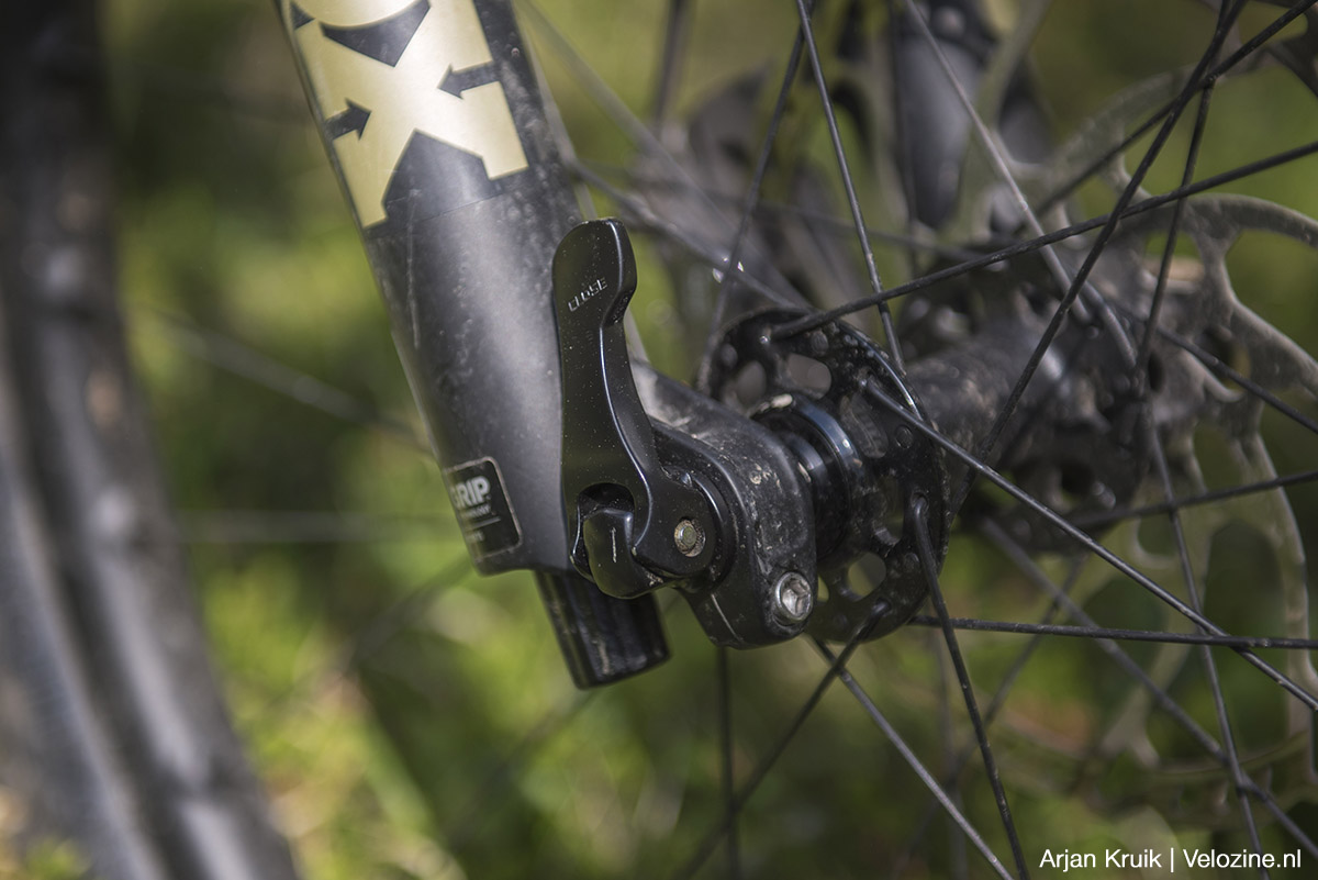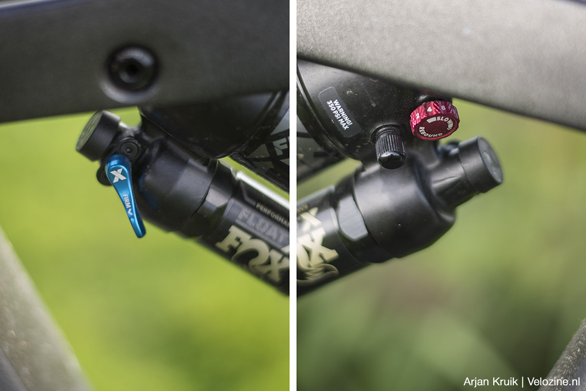 De 160 millimeter veerweg aan de voorkant wordt geleverd door een Fox 36 Performance met Grip-demper. Die laatste werkt traploos, zonder gedefinieerde klikjes. Je moet ‘m minstens een kwartslag verdraaien om meer demping te ervaren. Ik heb het dan over de demping van de íngaande slag. Ook de demping van de uitgaande slag is in te stellen, hier wel met kliks die duidelijk van elkaar verschillen.