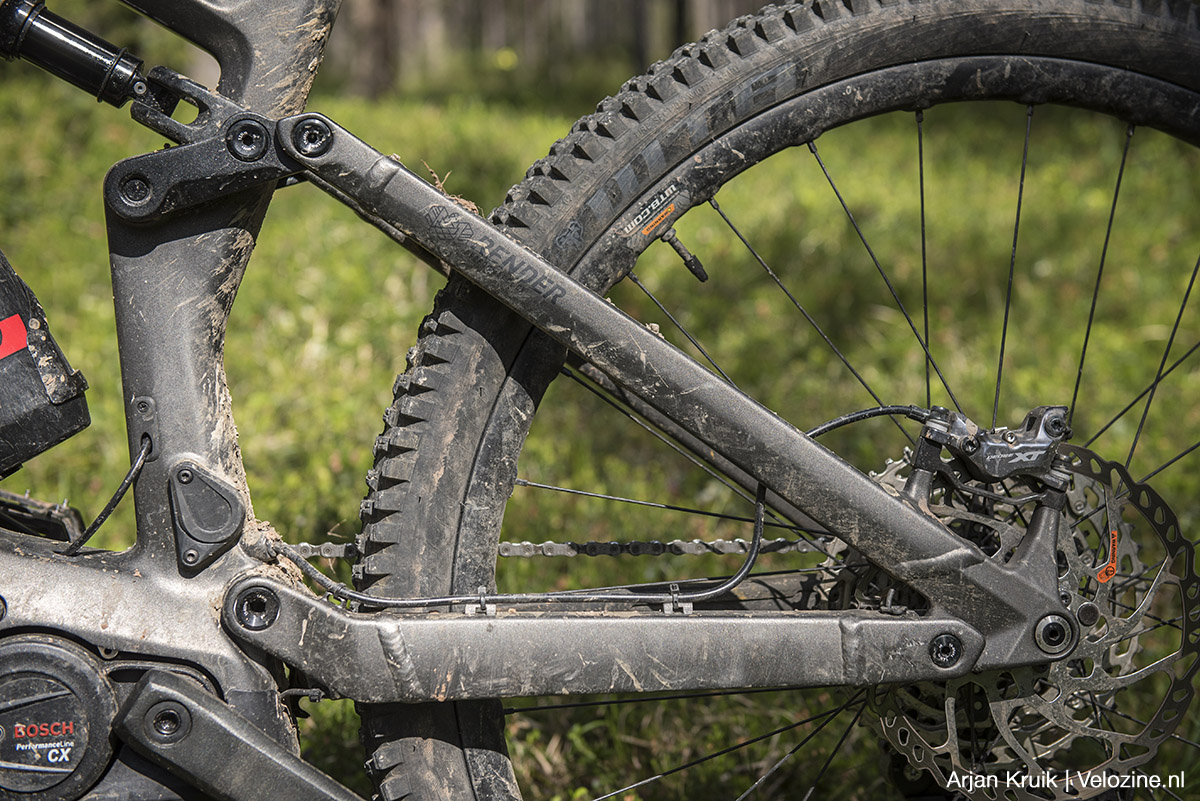 Het crankstel is van E*thirteen, met een aluminium 34-tands kettingblad. Fraai ding, maar persoonlijk zie ik op een e-mountainbike liever een stalen voorblad. Veel slijtvaster. Schakelen doet het spul prima, maar je moet met name op steile hellingen wel terughoudend zijn met agressieve multi-shifts; de kans is dan namelijk groot dat de cassette zich verslikt in de ketting. Stap voor stap de ketting naar een lichter verzet dirigeren is dan een betere strategie.