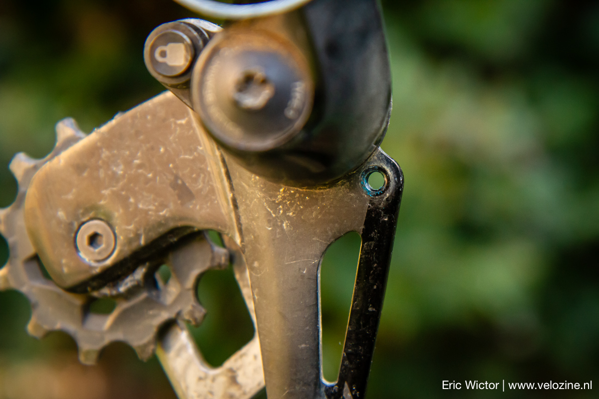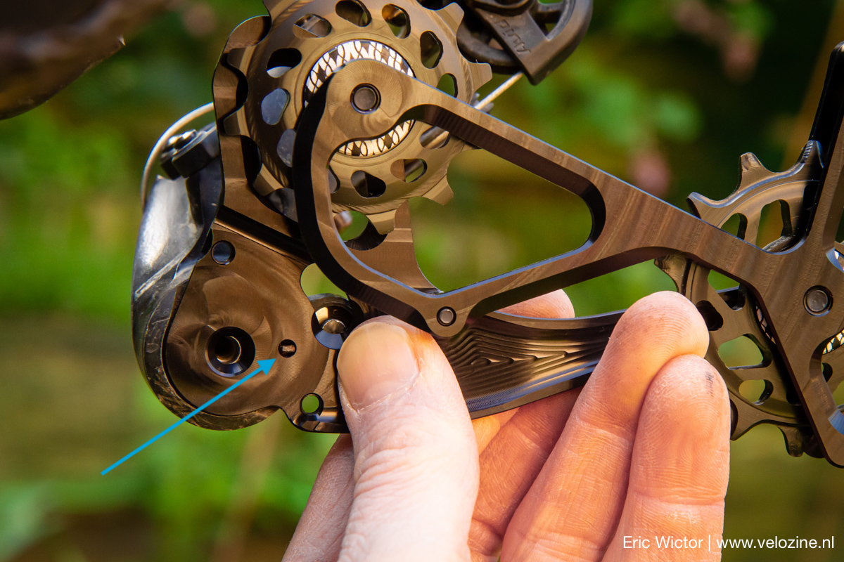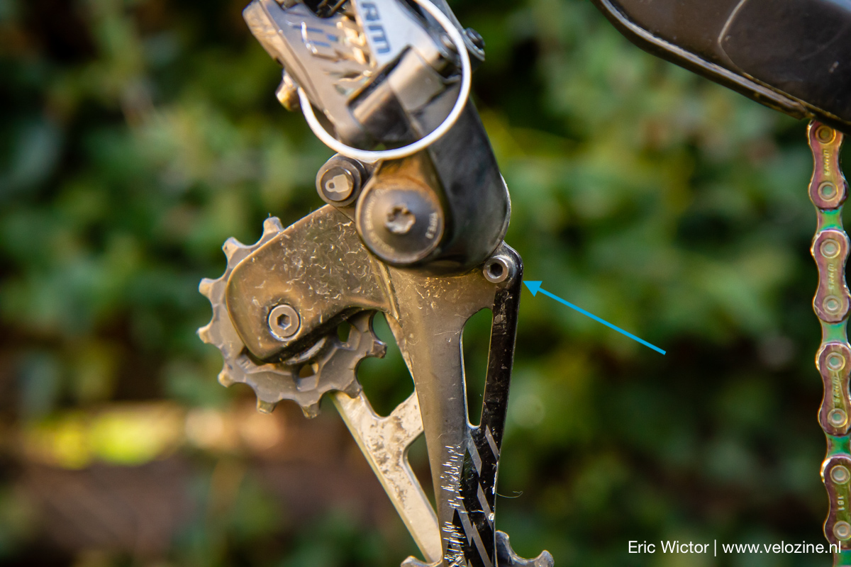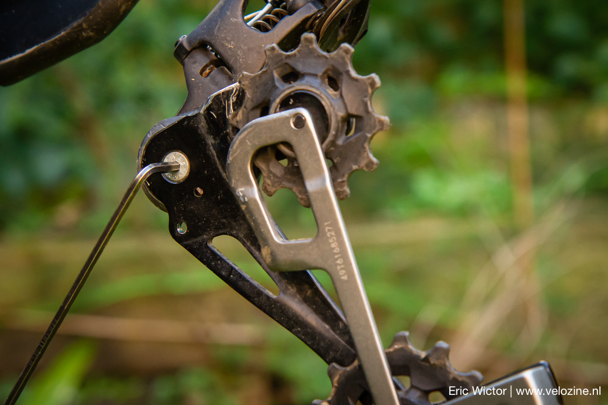 Direct na montage vallen twee zaken op. Ten eerste heeft het bovenste derailleurwieltje een grotere afstand van het draaipunt van de kooi gekregen. Dit heeft geen invloed op kettinglengte maar vereist wél een klein beetje meer verstelling van de hoek waaronder de derailleur onder je frame hangt. Deze ‘b-gap’-verstelling heeft invloed op de afstand van het bovenste derailleurwieltje ten opzichte van de cassette in alle versnellingen. Dus ook in hoeverre hij onder de 52t-krans kan komen. Het verschil is significant: zonder bijstellen is er niet fatsoenlijk mee te rijden.