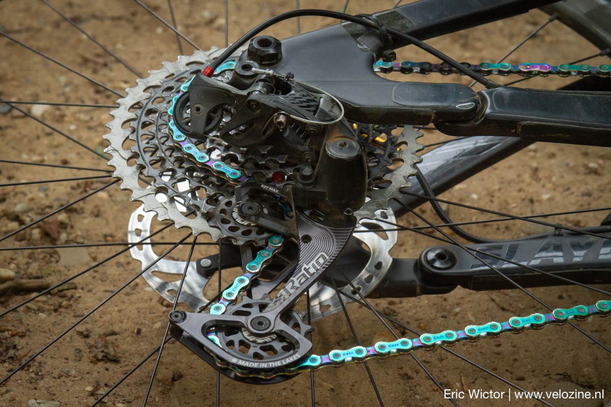 Ik monteerde de Ratio SR52-kooi dus op zo’n een eerste generatie Sram X01 Eagle 12-speed-derailleur. Dit is een model dat formeel dus ook géén 52t blad aan kan. Eagle 12-speed werd immers gelanceerd met 10-50t-cassettes. De fiets waar die derailleur op zit heeft veel anti-squat en chain growth, waardoor de afstelling van de originele derailleur nogal nauw luisterde. Het is dus een opstelling waar een nieuwe Eagle met een 52t-cassette niet echt lekker werkt