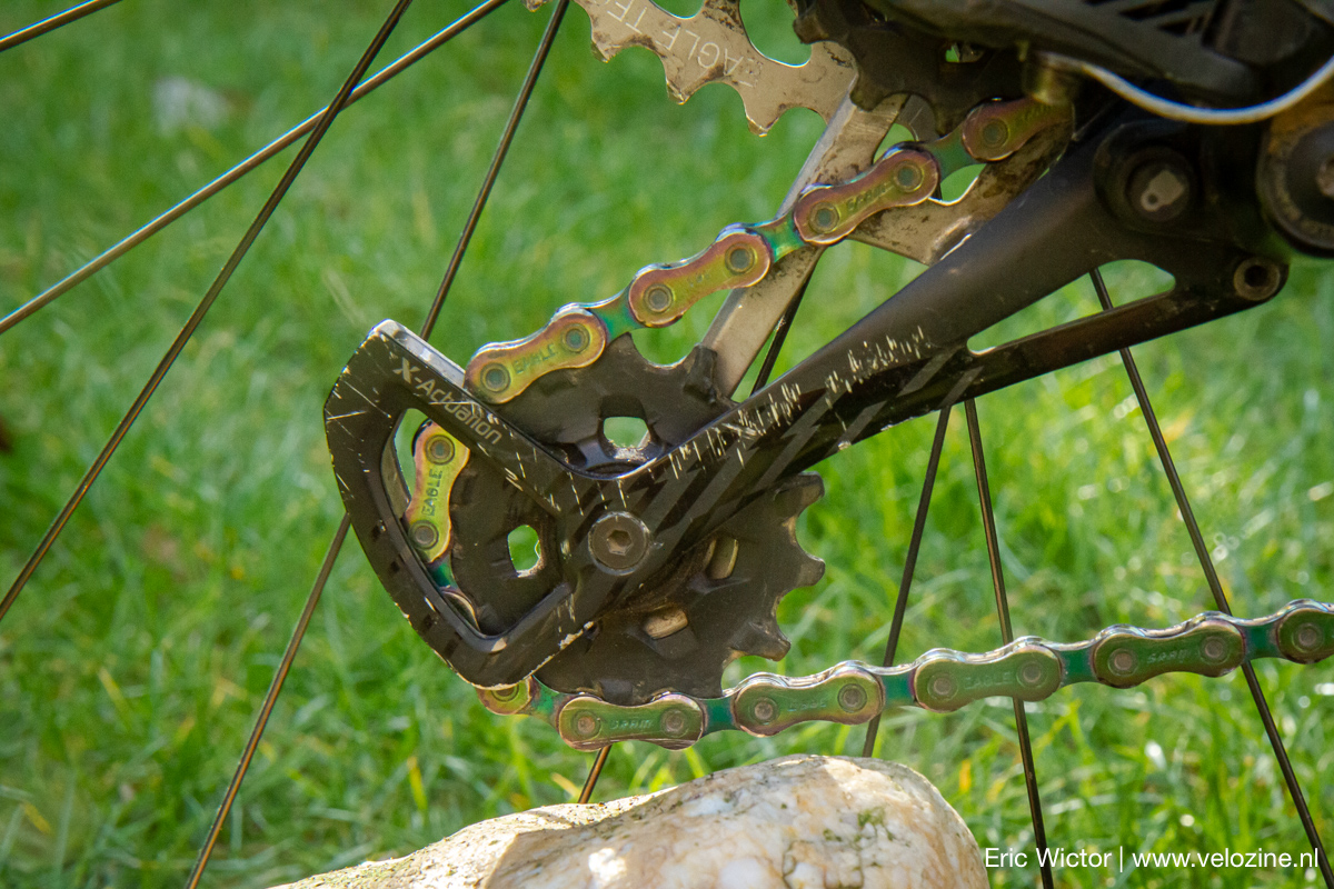 Waarom de focus op Sram-shifers en -derailleurs? Omdat naar eigen zeggen onderhouden en demonteren van de onderdelen véél simpeler is dan bij Shimano. Verderop laten we zien hóe simpel. Een kooi met een beduidend beter beschermd onderste derailleurwieltje zit ook in het programma. En sinds kort hangt die aan mijn X01-derailleur om daarmee ook de stap naar een 10-52t-cassette op mijn fiets mogelijk te maken.