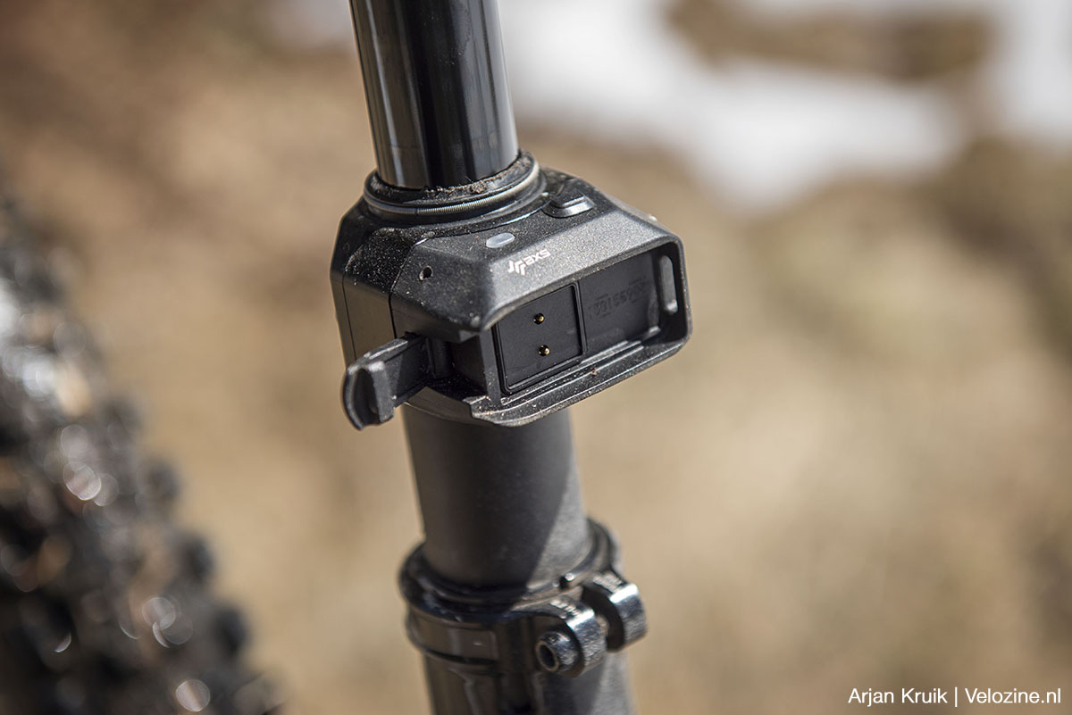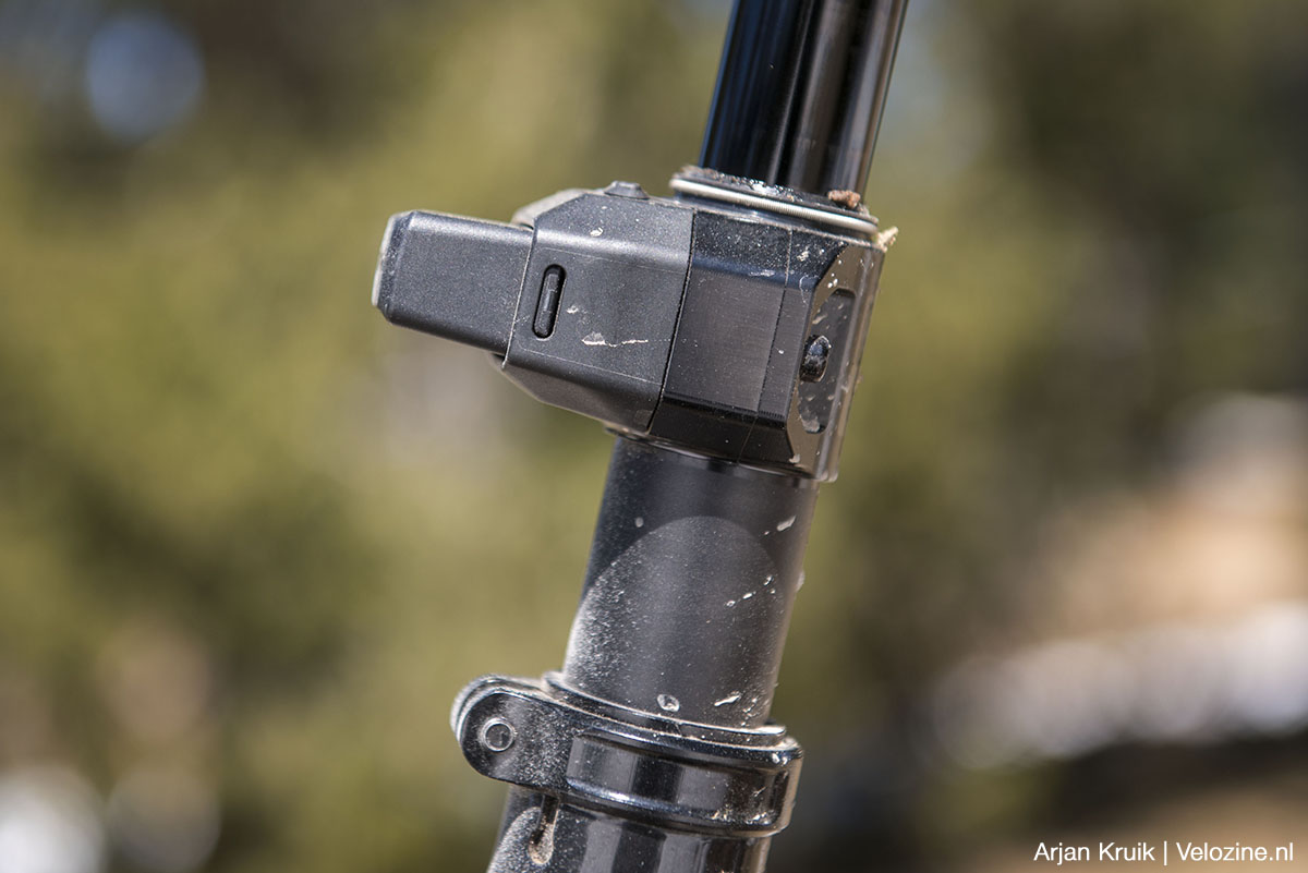En dan is er het nieuwe uiterlijk. Net als eerder Fox met z’n Transfer Neo, positioneert nu ook Rockshox de batterij en de elektronica aan de buitenkant van de buitenste buis. Geen fraaie oplossing, maar wel functioneel. Evenals Fox claimt Rockshox namelijk dat deze positie voorkomt dat de achterband de batterij raakt. Niet dat dat bij de oude Reverb AXS, met z’n onder het zadel geplaatste batterij, schering en inslag was. Maar toegegeven: in theorie kón dat inderdaad gebeuren.