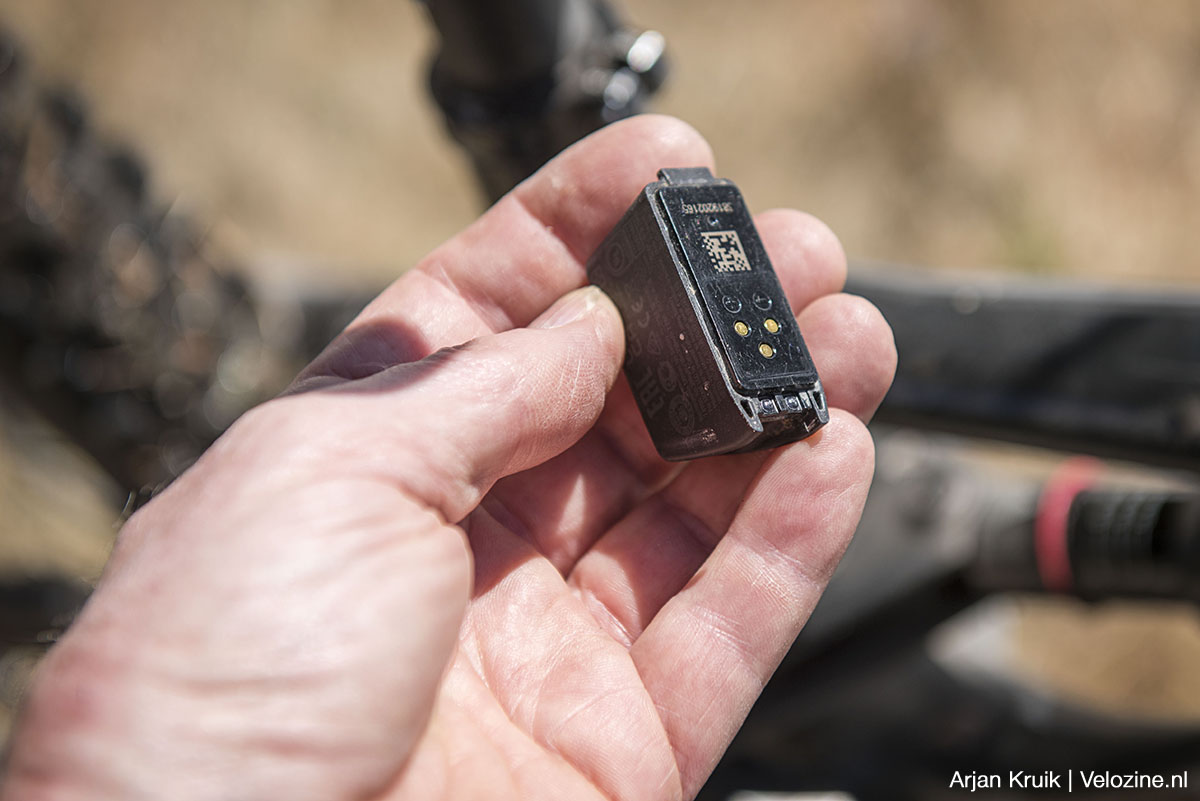Tot slot het batterijtje. Het los- en vastmaken is kinderspel. Klemmetje losklikken, klemmetje vastklikken, meer is het niet. Plus: het zijn exact dezelfde AXS-batterijtjes die ook m’n derailleur van stroom voorzien. Alhoewel… bij moderne e-mountainbikes is dat alweer achterhaalt. Immers; veel Sram Transmission-derailleurs op e-mtb’s betrekken hun stroom via een kabel bij de grote accu in de onderbuis. Mijn eerste gedachte: waarom kan dat niet bij de Reverb AXS? Dan ben je namelijk in één keer van al die losse batterijtjes af. En het ziet er nog ’s beter uit ook. Is dat wat, beste Rockshox-ingenieurs?